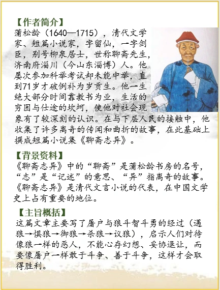 蒲松龄(1640—1715),清代文学家、短篇小说家,字留仙,一字剑臣,别号柳泉居士,世称聊斋先生,济南府淄川(今山东淄博)人。他屡次参加科举考试却未能中举,直到71岁才破例补为岁贡生。他一生绝大部分时间靠教书为业,生活的穷困与仕途的坎坷,使他对社会现象有了较深刻的认识。在与下层人民的接触中,他收集了许多离奇的传闻和曲折的故事,在此基础上撰成短篇小说集《聊斋志异》。