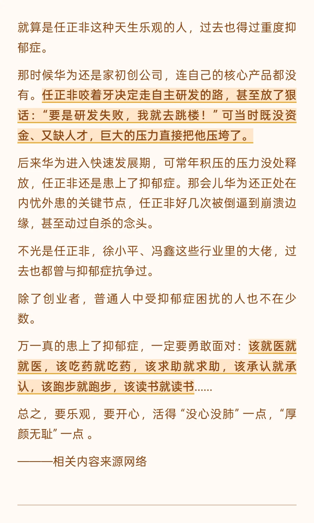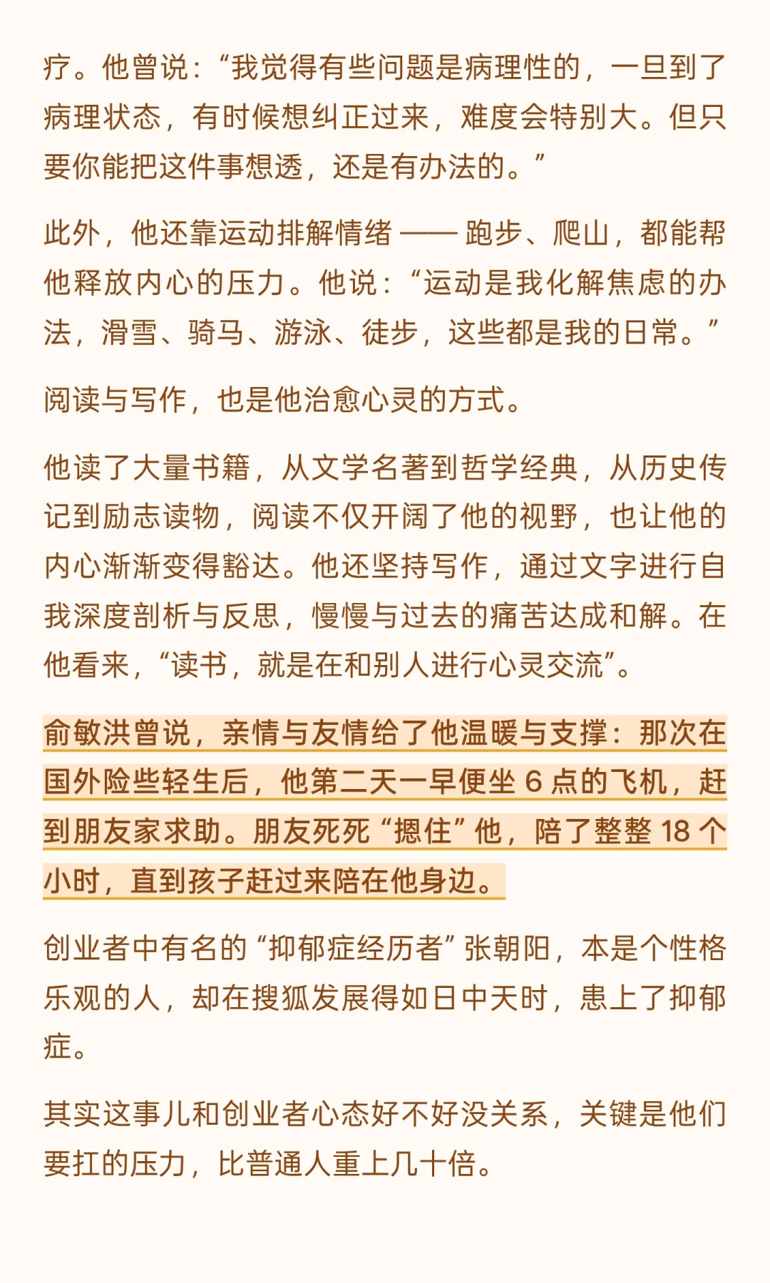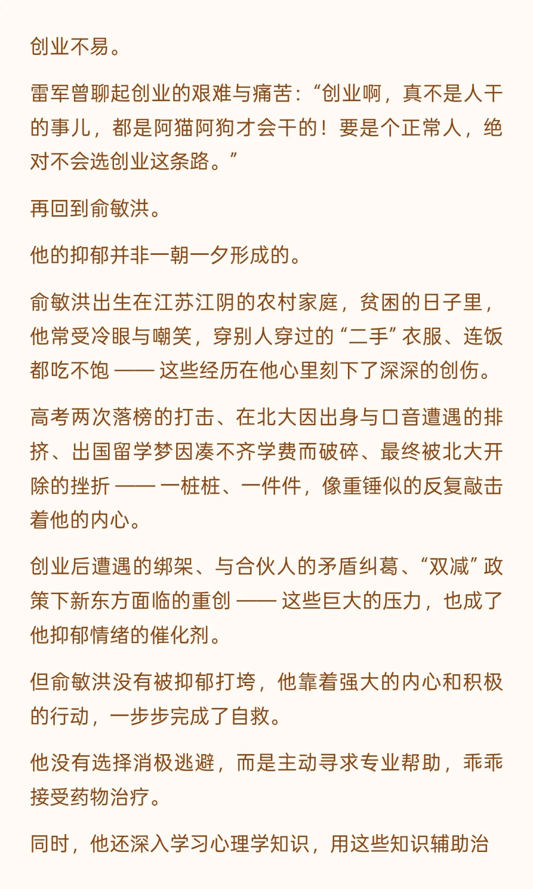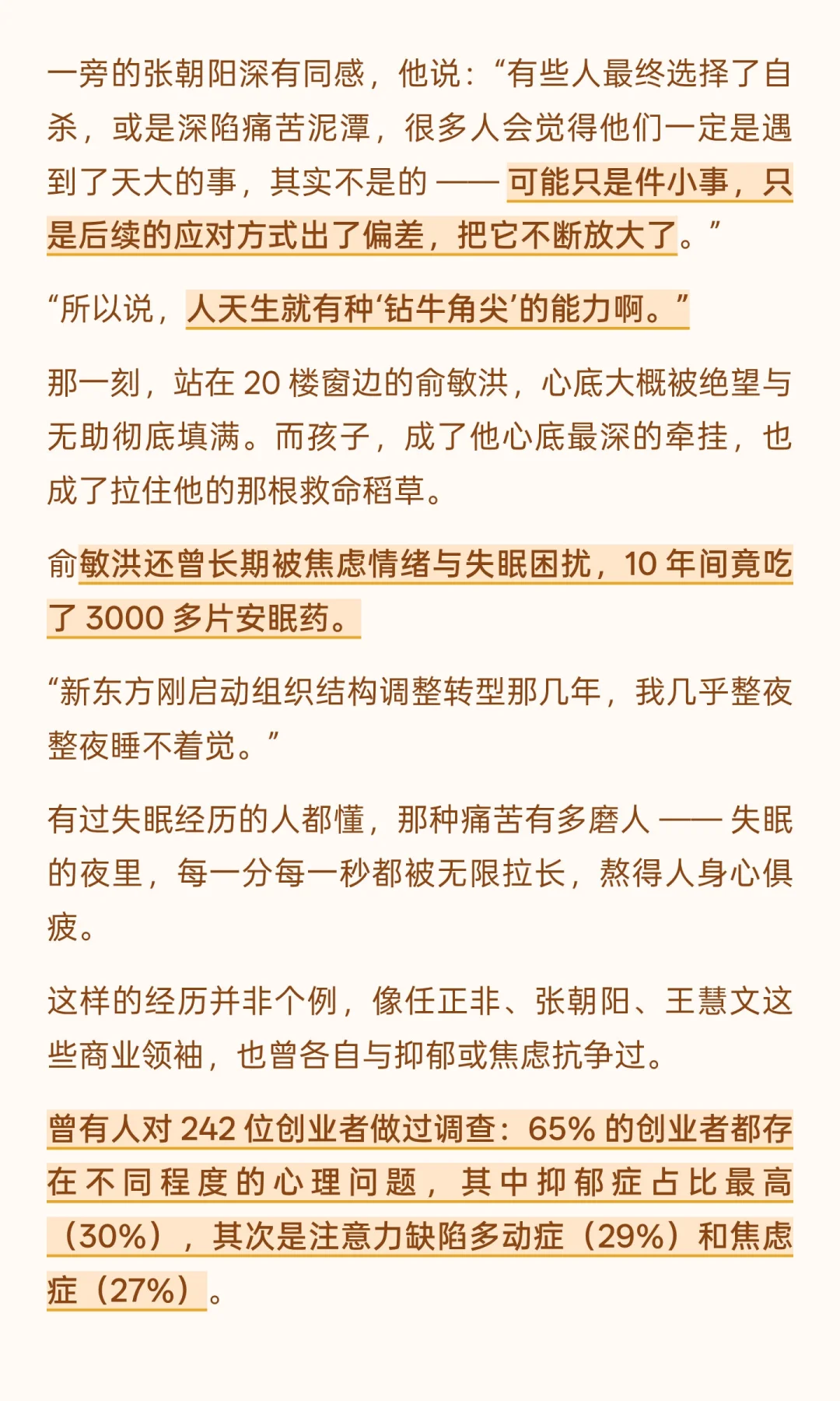 俞敏洪曾在和张朝阳的对谈中坦诚提及:“我曾经几乎患上了狂躁症,有一次在加拿大首都渥太华出差,站在 20 楼的窗边,满心都是跳下去的念头。但一想到孩子,就知道自己绝对不能跳,于是穿上羽绒服,在零下 30 摄氏度的大街上走了整整 4 个小时。” 一旁的张朝阳深有同感,他说:“有些人最终选择了自杀,或是深陷痛苦泥潭,很多人会觉得他们一定是遇到了天大的事,其实不是的 —— 可能只是件小事,只是后续的应对方式出了偏差,把它不断放大了。” “所以说,人天生就有种‘钻牛角尖’的能力啊。” 那一刻,站在 20 楼窗边的俞敏洪,心底大概被绝望与无助彻底填满。而孩子,成了他心底最深的牵挂,也成了拉住他的那根救命稻草。 俞敏洪还曾长期被焦虑情绪与失眠困扰,10 年间竟吃了 3000 多片安眠药。 “新东方刚启动组织结构调整转型那几年,我几乎整夜整夜睡不着觉。” 有过失眠经历的人都懂,那种痛苦有多磨人 —— 失眠的夜里,每一分每一秒都被无限拉长,熬得人身心俱疲。 这样的经历并非个例,像任正非、张朝阳、王慧文这些商业领袖,也曾各自与抑郁或焦虑抗争过。 曾有人对 242 位创业者做过调查:65% 的创业者都存在不同程度的心理问题,其中抑郁症占比最高(30%),其次是注意力缺陷多动症(29%)和焦虑症(27%)。 创业不易。 雷军曾聊起创业的艰难与痛苦:“创业啊,真不是人干的事儿,都是阿猫阿狗才会干的!要是个正常人,绝对不会选创业这条路。”