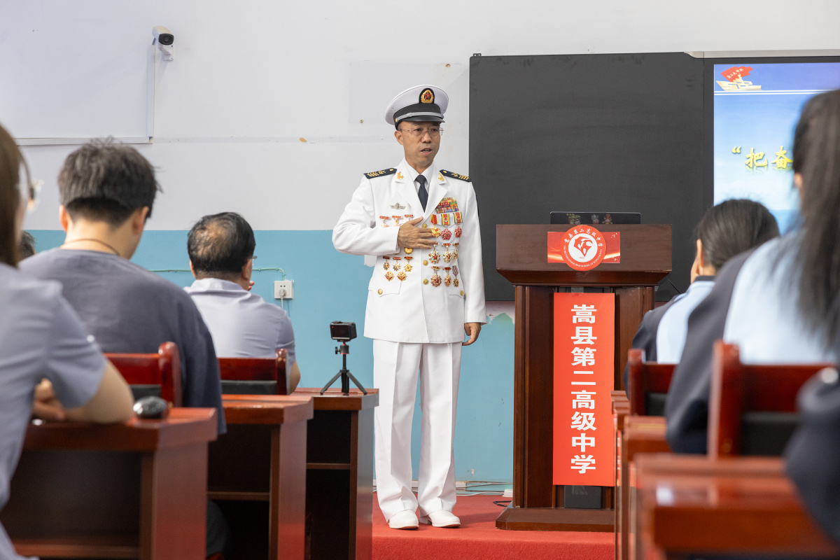 当天,嵩县二高的教室内座无虚席。马少利身着洁白军装,胸前的勋章在阳光下熠熠生辉。他身姿挺拔、目光坚毅,面对台下稚嫩而充满朝气的面孔,深情回顾了在嵩县二中的求学时光,分享了从普通农村青年成长为海军一级军士长的心路历程。