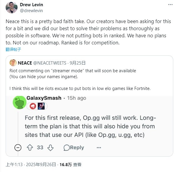 Riot:这完全是一种恶意揣测。我们的创作者一直希望实现这个功能,我们也尽力通过软件尽可能彻底地解决他们的问题。我们从未也绝不会在排位赛中引入机器人,目前没有任何相关计划,这根本不在我们的路线图上。排位赛的核心始终是竞技性。