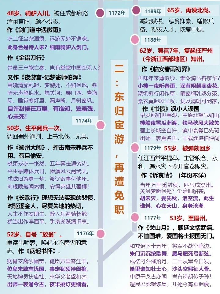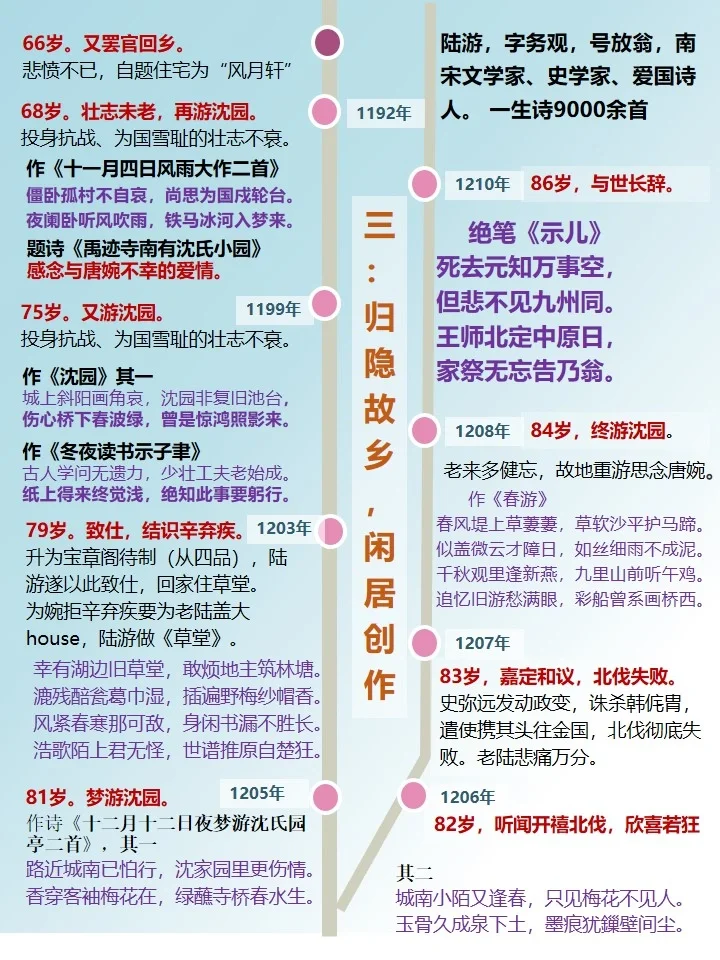 ✅陆游,字务观,号放翁, 越州山阴(今浙江绍兴)人,南宋文学家、史学家、爱国诗人。 . ✅陆游一生诗词成就斐然,留下诗词9000余首,是李白、杜甫、白居易等创作之和。 🍃这个创作数据反映了背后的凄凉,得亏是生在尊重文人、士大夫的宋朝,如果生在盛唐那得遭受多大磨难。 1⃣为什么叫陆游❓ 🍃陆游出自书香世家,爷爷官至尚书右丞,他出生在老爹上京赴任的官船上,淮河之子,老爹也是随性,直接取名陆游。 . 2⃣为何进士第—落榜❓ 🍃有才成了罪过。 进士笔试搞了个全国第—,本是好事,结果第二是秦桧的孙子,这不就完犊子了。到复试的时候直接淘汰,公务员没得当了,初仕不利。 . 2⃣谁是他一生的牵挂❓ 🍃青梅竹马的唐婉表妹。 小陆20岁与她结为夫妻,无奈屡考不中、还没孩子,硬生生被老娘拆散。老陆一生为唐婉写诗无数,84岁还游沈园,只为追忆唐婉,得不到的是蕞好的。 . 3⃣一生的梦想是什么❓ 🍃收复失地,恢复旧山河。 他三岁经历家国破碎,内心的抱负伴随一生。怎奈南宋朝廷大数据显示,主和派占据上风,这就让小陆饱受苦闷折磨,要不也创作不了这么多脍炙人口的诗词吧,临终绝笔都不忘,王师北定中原日。 . ✅陆游一生三阶段 1⃣少年到中年(46岁) ,时间蕞长但留存作品蕞少,约200首,因小陆对自己要求太高,嫌追求辞藻,意义平凡而删除。 2⃣骑驴入蜀到归乡,46-54岁,诗约2400多首。因深入军旅生活,诗风豪放壮阔,爱国思想也更加提升。诗歌创作成熟丰富,奠定一代文宗的地位。 3⃣蛰居家乡到仙逝。现存诗6500首。数量多表明活的更惆怅,可能也是时间多了。与农民接触较多,再加上宦海沉浮饱经忧患,且年事已高,风格转为清旷淡远和苍凉人生感慨。 . ✅三次怎么变,唯不变的是家国情怀,这也是他蕞大的特色与传颂千古的原因。 ✅他一生有真爱、有国恨、有恢复山河的执念、有不屈不挠的勇气。 ✅没有因打压而屈从,没有因困顿而放弃,没有因失去而消沉。 . ✅陆游不是为个人而忧伤,他忧的是国家、民族,他是个有骨气的爱国诗人。 . 我是恬小雨,感谢关注,精读细读!