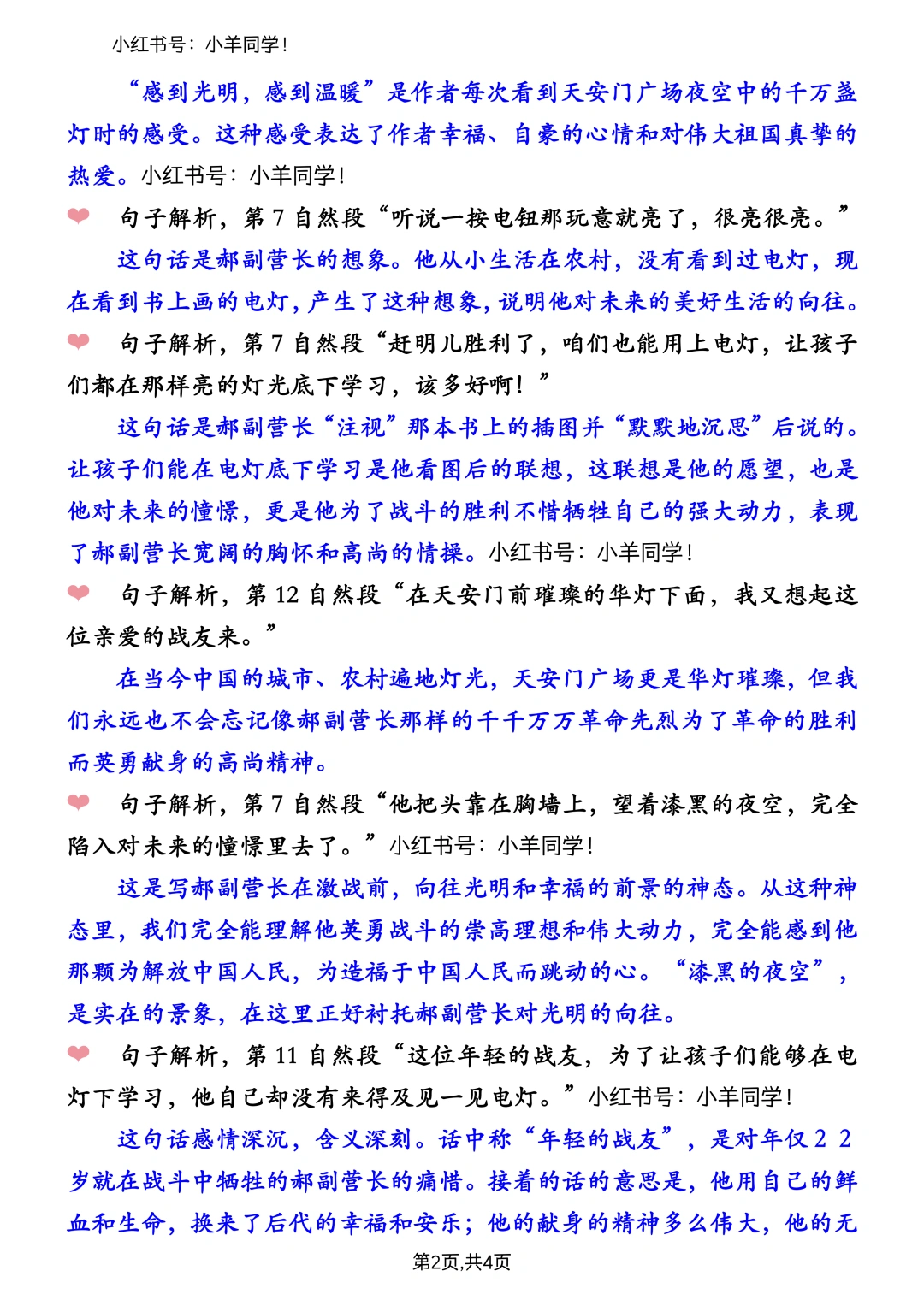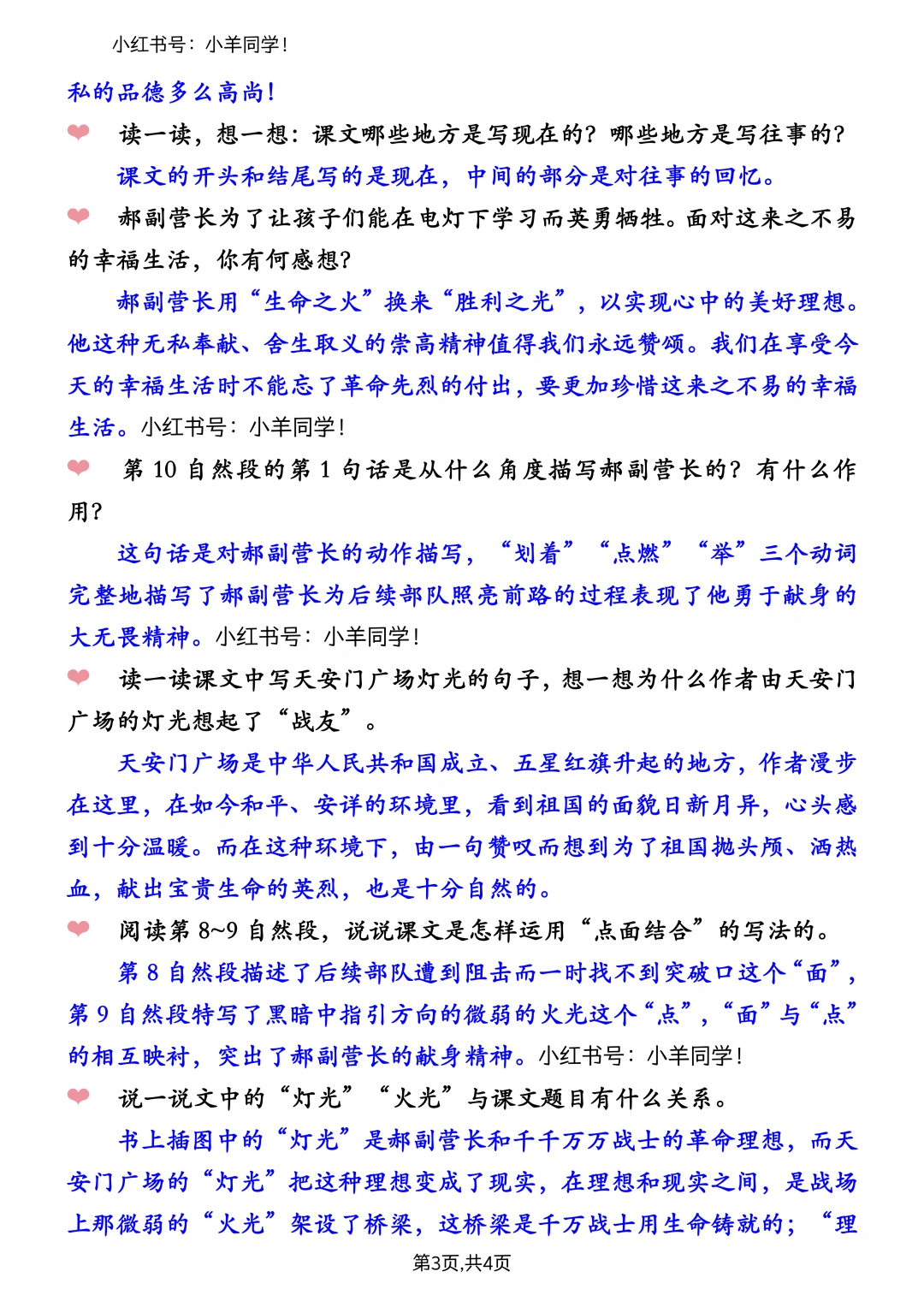 学习目标: 1.读准文中注音的字,理解“胸墙、憧憬、黑魆魆、千钧一发、璀璨”等词语的意思。 2.把握文章的主要内容,理清天安门前璀璨的灯光、郝副营长书上插图中的灯光和战场上微弱的火光三者之间的联系,以及它们与课文题目之间的联系(重点) 3.关注郝副营长的语言、神情、行为,理解革命战士的无私奉献精神,懂得珍惜现在的幸福生活。(重点)