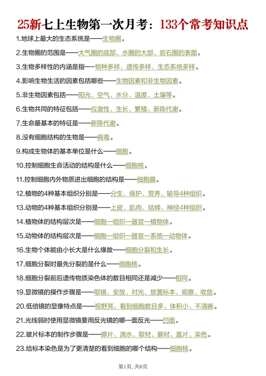 必背知识点 知识点总结 准初一 六升七 七年级上册生物 初中生物怎么学 生物笔记 陪读妈妈月考 必考考点