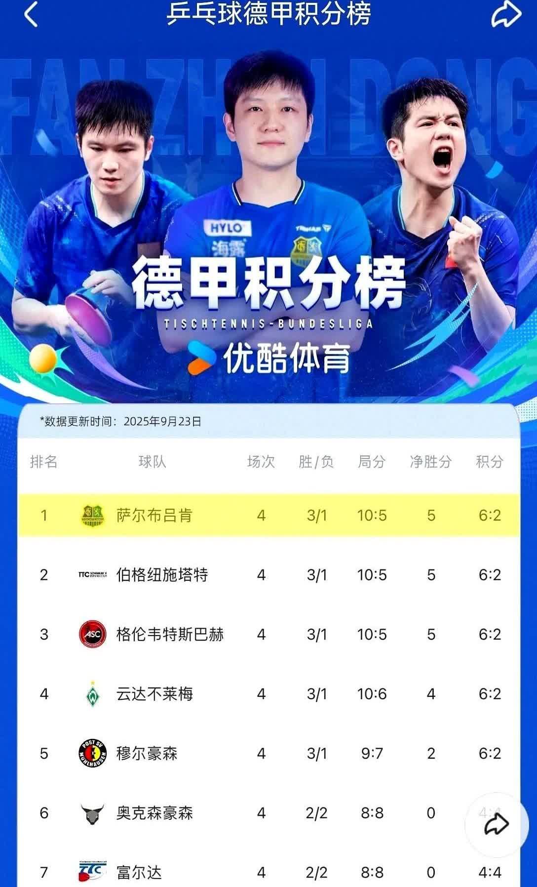 德国乒乓球联赛这水,是真深。 新科世界冠军邱党,我们都喊他“东哥”,开赛就直接来了个两连败。 这一下,卫冕冠军萨尔布吕肯队直接被推到了风口浪尖上。 很多人都在嘀咕,是不是不行了?其实原因很简单,东哥满世界打WTT比赛,铁人也扛不住这么连轴转,身体累,精力也跟不上。他很快就在第三轮用一场快刀斩乱麻的胜利,告诉所有人他回来了。 真正厉害的,是萨尔布吕肯这个队。他们压根就没把宝全押在东哥一个人身上。第四轮比赛,教练干脆让东哥轮休,结果队长弗朗西斯卡站了出来,一个人拿下两分,带着队伍照样赢球。 这个队里,除了东哥和队长弗朗西斯卡,还有斯洛文尼亚的约奇克和日本的村松雄斗,个个都是能独当一面的狠角色。 这种阵容厚度,就是他们敢让世界冠军休息的底气,也是他们能跟拥有波尔的杜塞尔多夫队掰手腕的资本。 所以说,萨尔布吕肯能排第一,靠的不是一个人的光环。 是整个团队的硬实力。