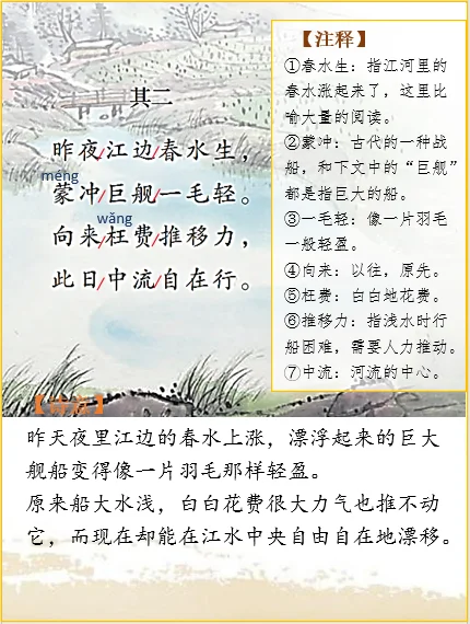 原来船大水浅,白白花费很大力气也推不动它,而现在却能在江水中央自由自在地漂移。