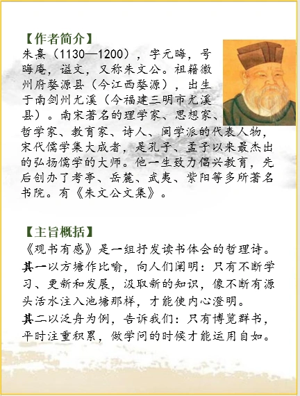 其一以方塘作比喻,向人们阐明:只有不断学习、更新和发展,汲取新的知识,像不断有源头活水注入池塘那样,才能使内心澄明。