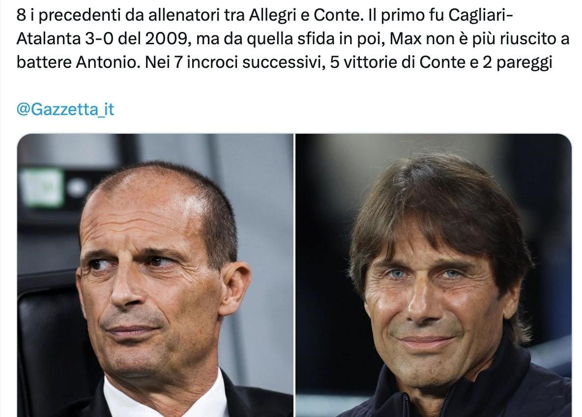 孔蒂完全压制阿莱格里!阿莱格里执教的球队仅2009年的卡利亚里赢过孔蒂1次,后面