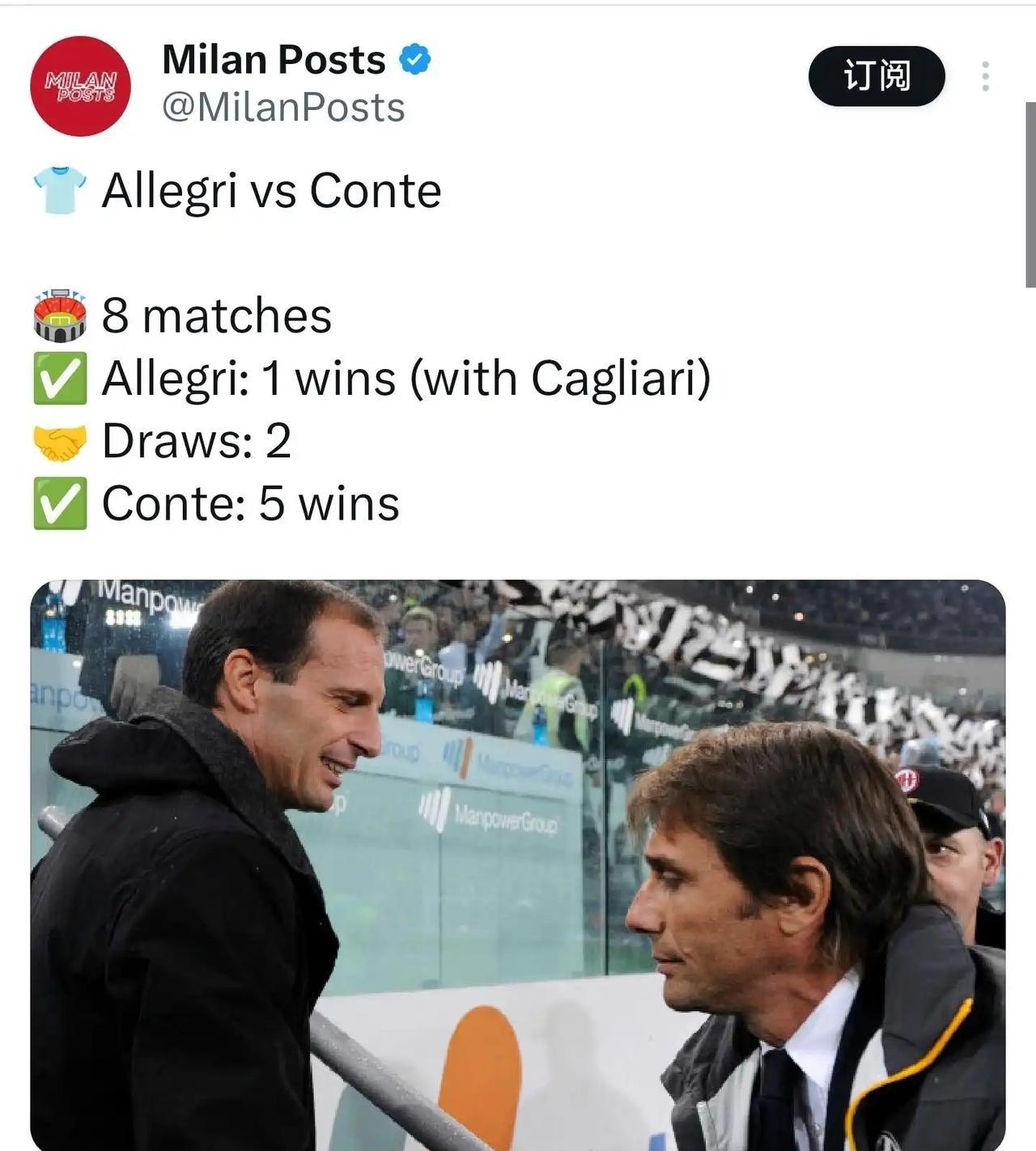 孔蒂完全压制阿莱格里!阿莱格里执教的球队仅2009年的卡利亚里赢过孔蒂1次,后面7次交锋,孔蒂5胜2平。阿莱格里为自己证明的时候到了!这个记录貌似就是在米兰的记录,阿莱格里上次离开米兰去的就是尤文图斯,孔二愣子就去英超了,没有机会再次交手,去年孔蒂回意甲加盟那不勒斯,但阿莱格里在家休息也没有交手机会,所以这个记录应当是之前阿莱格里带米兰与孔蒂的尤文图斯交手的记录。 其实这个记录对阿莱格里有点不公平,有参考价值的就是第一年,踢完欧冠后客场一球小负,主场被捞球。第二年开始伊布和弟媳打包转卖给巴黎圣日耳曼后米兰就基本无力对抗尤文图斯了。今年还真的是双方实力上最接近的一次,期待如大家期待的那样,两位意大利最优秀的主教练可以为我们带来一场精彩的比赛。 期待阿莱格里平和心态,球队摆正心态,先立足于防守,平局可以接受,把控球权给那不勒斯让那不勒斯控球,让他们攻咱打反击,下半场把莱奥换上来给迪洛伦佐与拉赫马尼好好操练一下。