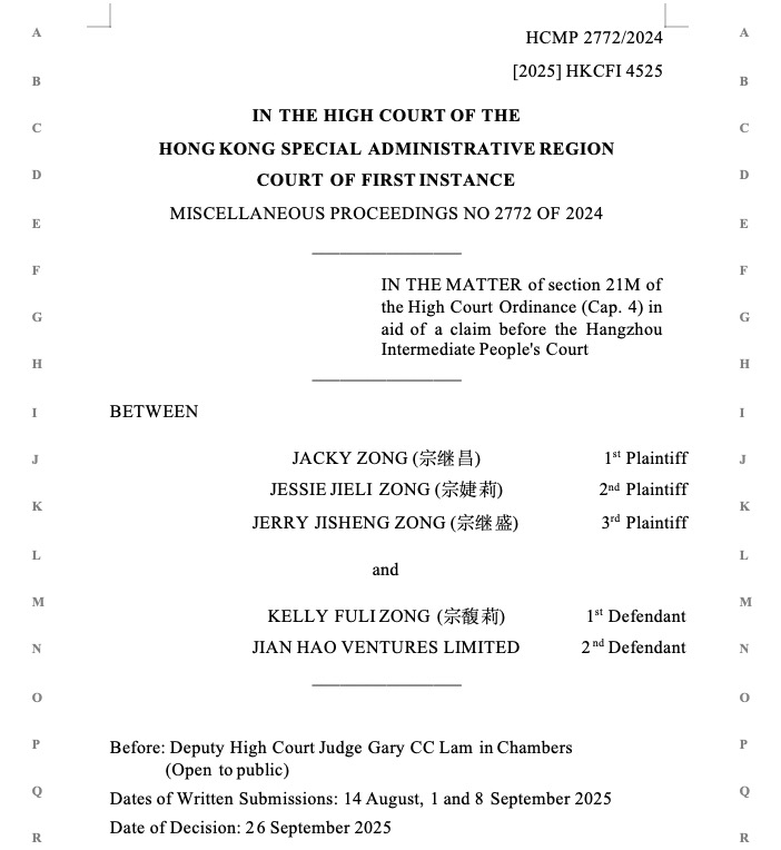 此前,香港高等法院于8月1日判决批准了三位原告宗继昌、宗婕莉和宗继盛申请的临时禁令,禁令要求被告宗馥莉和“建浩创投有限公司”在杭州中级人民法院及浙江高级人民法院相关诉讼有处理结果前,不得提取或抵押“建浩创投有限公司”在香港汇丰银行账户的资产。此外,法院责令被告全面披露资金流向。