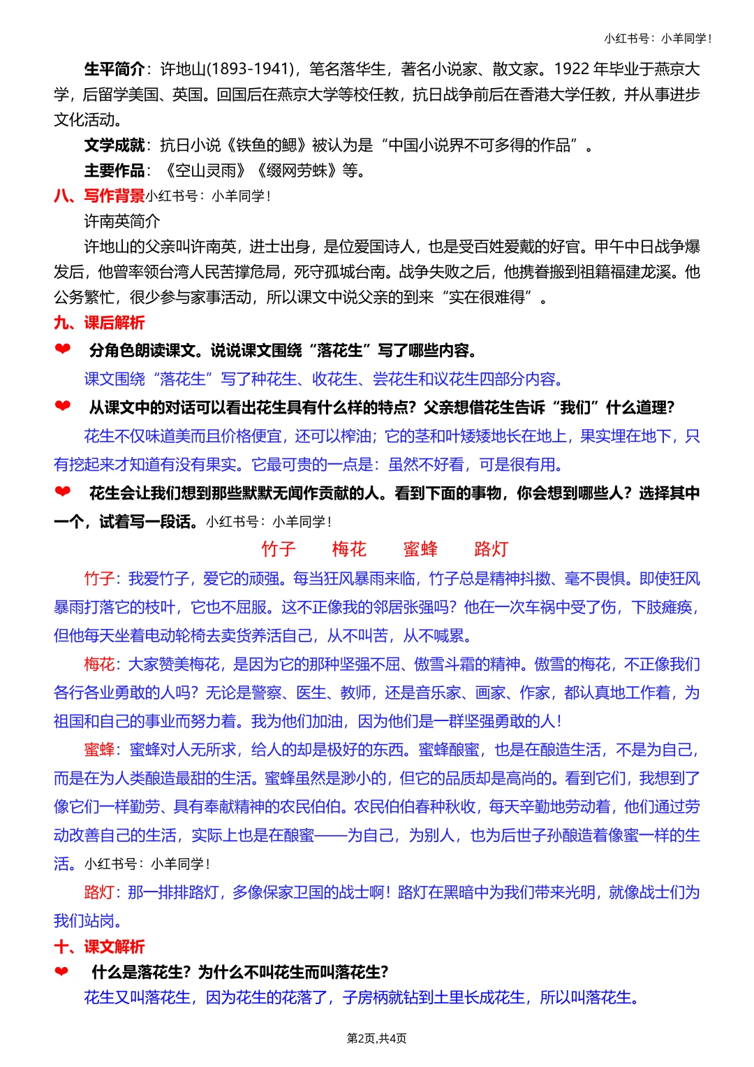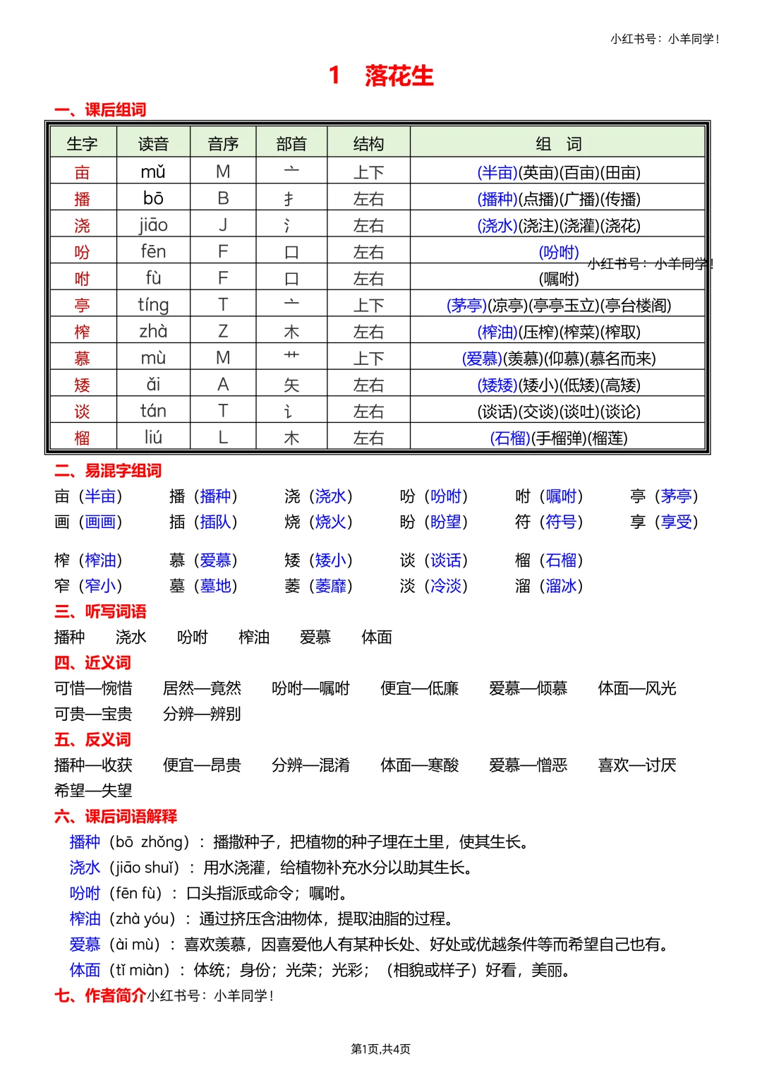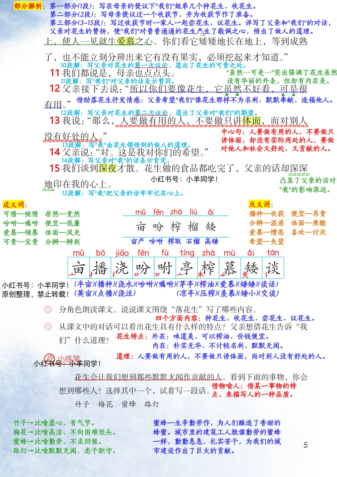 📚学习目标: ✅认识“亩、”等5个生字,会写“亩、播”等10个字,会写“播种、浇水”等词语。 ✅分角色朗读课文,了解课文围绕“落花生”写了哪些内容。 能理解含义深刻的语句,初步了解课文借助落花生说明的做人的道理。(重点) ✅了解课文借助具体事物抒发感情的方法,能仿照课文的写法,写由某一种事物想到的人。(重点)