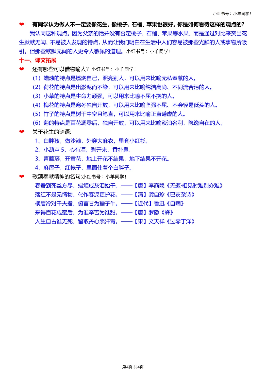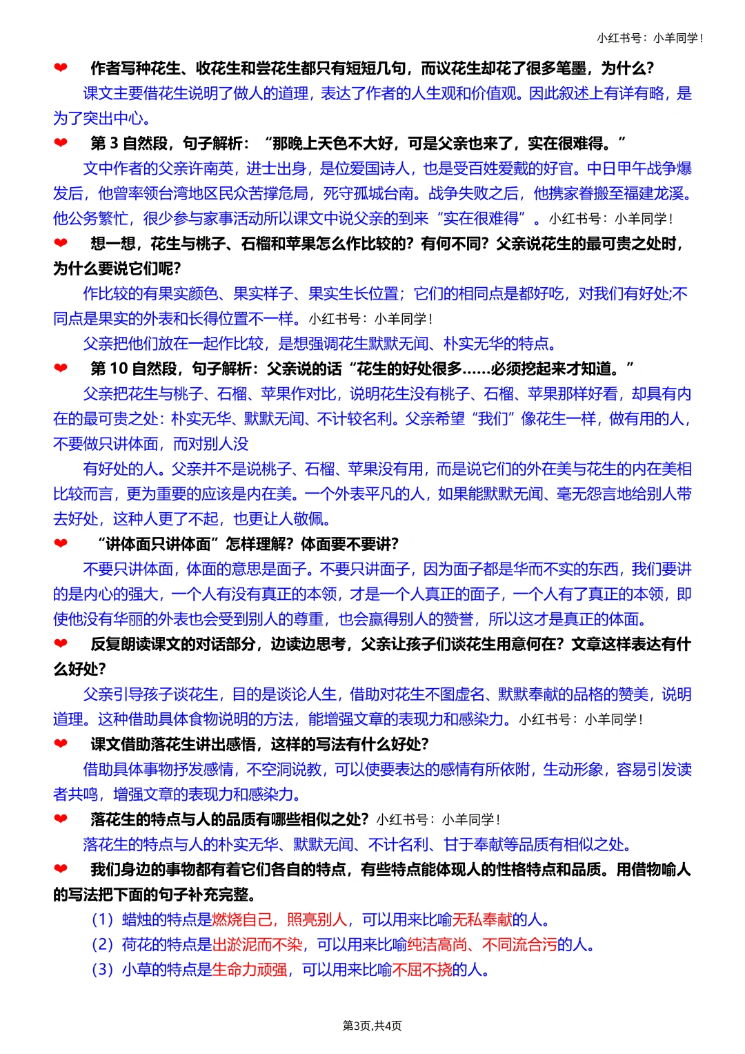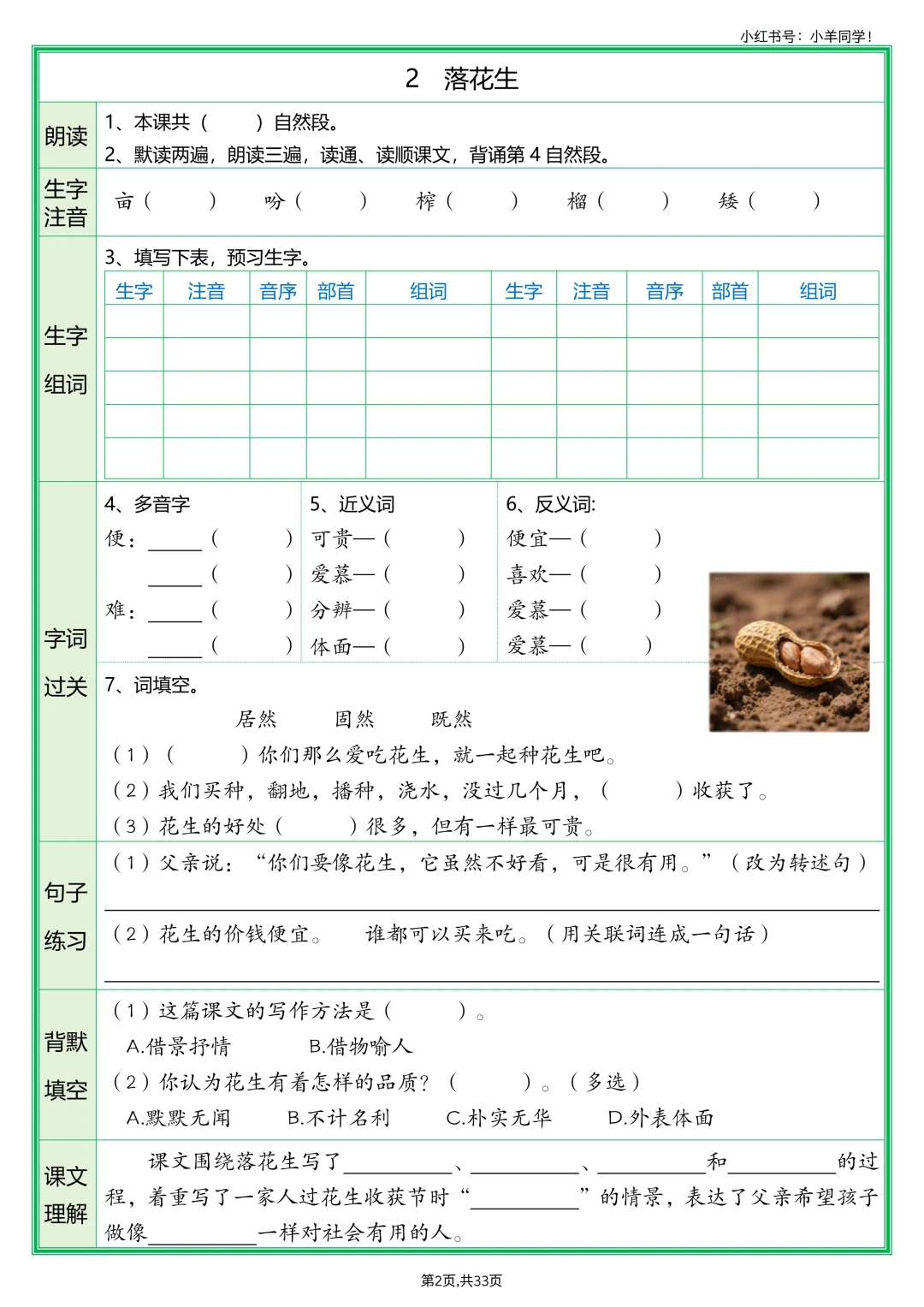 📚学习目标: ✅认识“亩、”等5个生字,会写“亩、播”等10个字,会写“播种、浇水”等词语。 ✅分角色朗读课文,了解课文围绕“落花生”写了哪些内容。 能理解含义深刻的语句,初步了解课文借助落花生说明的做人的道理。(重点) ✅了解课文借助具体事物抒发感情的方法,能仿照课文的写法,写由某一种事物想到的人。(重点)