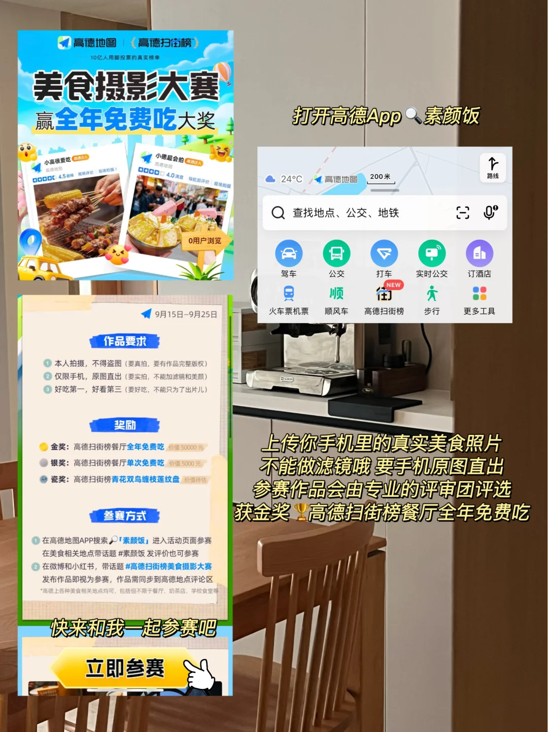 最近高德上线了一个扫街榜美食摄影大赛 要求只有一条 手机直拍 无滤镜无P图 金奖🏆高德扫街榜上榜餐厅全年免费吃 哇偶 这太简直适合我啦 上传上传📷 我来告诉你们怎么参加 ⏰9.15-9.25 🌟在高德App搜:素颜饭 🌟点击进入活动页面 🌟在美食相关地点 带上话题素颜饭 🌟上传手机里的直拍美食图片 🌟发表评论就可以参赛 像我自己在家做的饭也可以上传 选了几张最近的小饭桌 又漂亮又好吃 都是由专业的评审团进行评选 🥇🥈🥉的奖品 看着都很不错呀 我已经冲了 看看能不能实现吃饭自由 刚好我这几天在大连出差 不知道吃什么 赶紧打开高德🔍【高德扫街榜】 里面全是真实食客用脚投票的结果 跟着他们去找宝藏小店 应该不会踩雷 最近的漂亮饭: 豉油鸡肉饭🍗 香菜番茄蘑菇汤🍅 橄榄菜四季豆🫒 小葱炒鸡蛋🍳 奶油蜜瓜拿铁🧋 菠萝牛肉饭🍍 番茄牛肉丸汤🍢 荔枝牛乳布丁🍮 凉拌西芹🎍 油焖大虾🍤 青椒小炒肉🫑 蓝莓葡萄🍇 柠檬糖浆番茄🍅 花生冰浆🥜 番茄咖喱炖牛肋条🥩 鸡蛋炒秋葵🥚 黄油煎杏鲍菇🍄 冰淇淋咖啡冻🍨