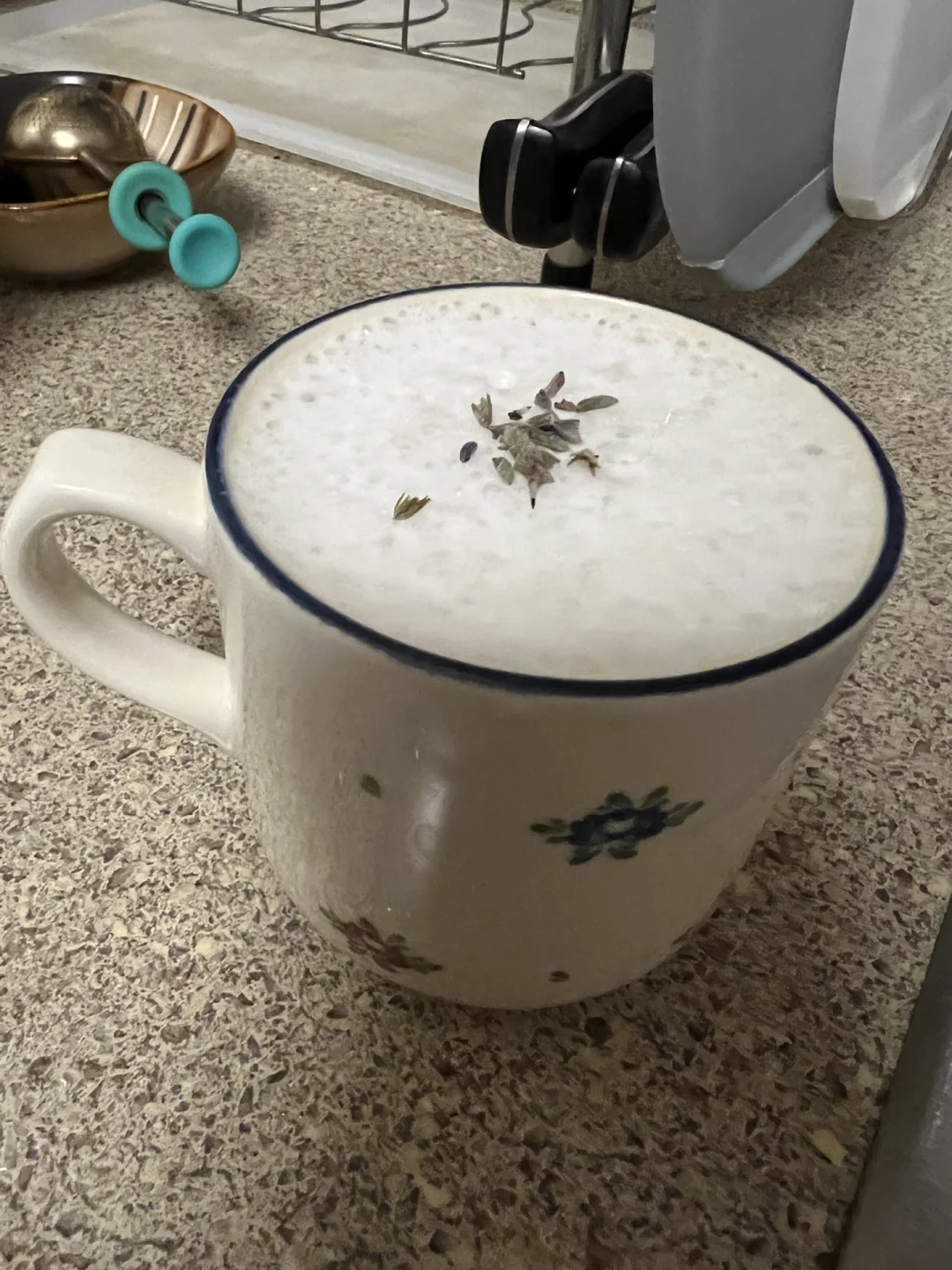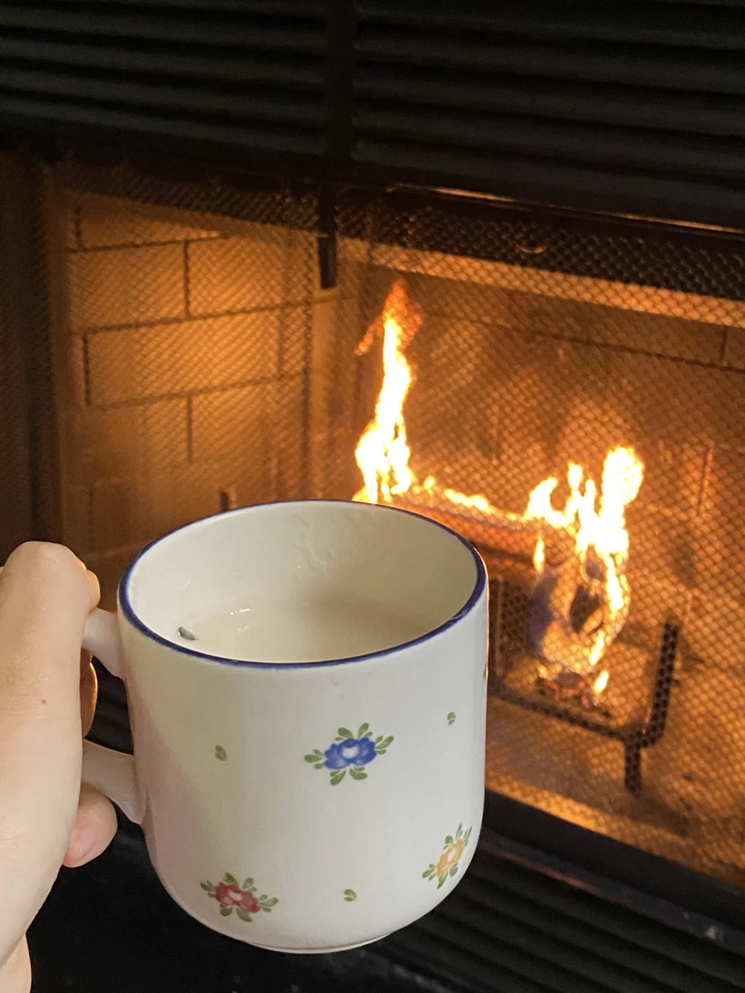 坐在壁炉边,喝着热热的茶酒,窝在一起看视频,有一搭没一搭地聊天,可以说是当代版的“绿蚁新醅酒,红泥小火炉,晚来天欲雪,能饮一杯无”了。 - 一直都很爱喝Earl Grey,红茶味浓郁又带着一丝柑橘的清新。看到On the Rock 发的琴酒版London Fog,在伯爵茶的基础上多了绵密的奶泡和馥郁的琴酒;瞬间就心动了,这个周末下雨又降温,很应景,男友就凑了材料给我做了。 - 食材,做法,配比都是按原版做的: 食材:伯爵茶包一个,全脂牛奶约100ml,薰衣草少许,蜂蜜少许。 做法: 300ml滚水加入一个茶包和少许薰衣草,泡一杯热茶; 全脂牛奶加热,加少许蜂蜜打奶泡; 将奶泡盖在茶上,用蜂蜜点缀。 - 唯二两个改动就是: 原食谱把蜂蜜和热茶融合,而我加在牛奶里,这样奶泡用剩下的、就是好喝的蜂蜜牛奶。 男友的Gin是绿茶风味的,感觉也挺搭。 - 第一口先是柔软甜蜜如梦乡的蜂蜜奶泡,接着牛奶与茶汤融合,带一点苦涩,一点微醺,一点芳香,是成年人爱喝的小饮料。