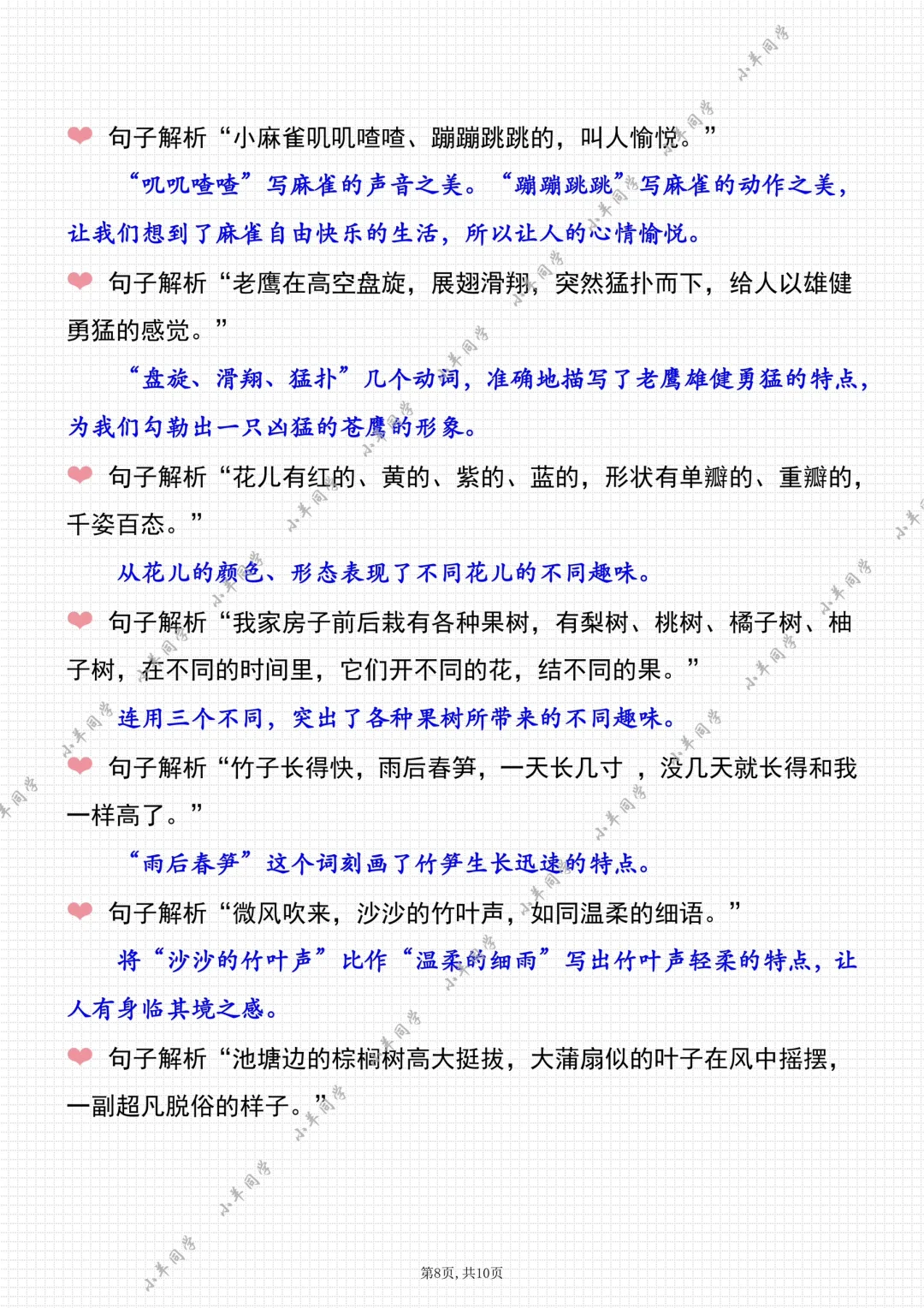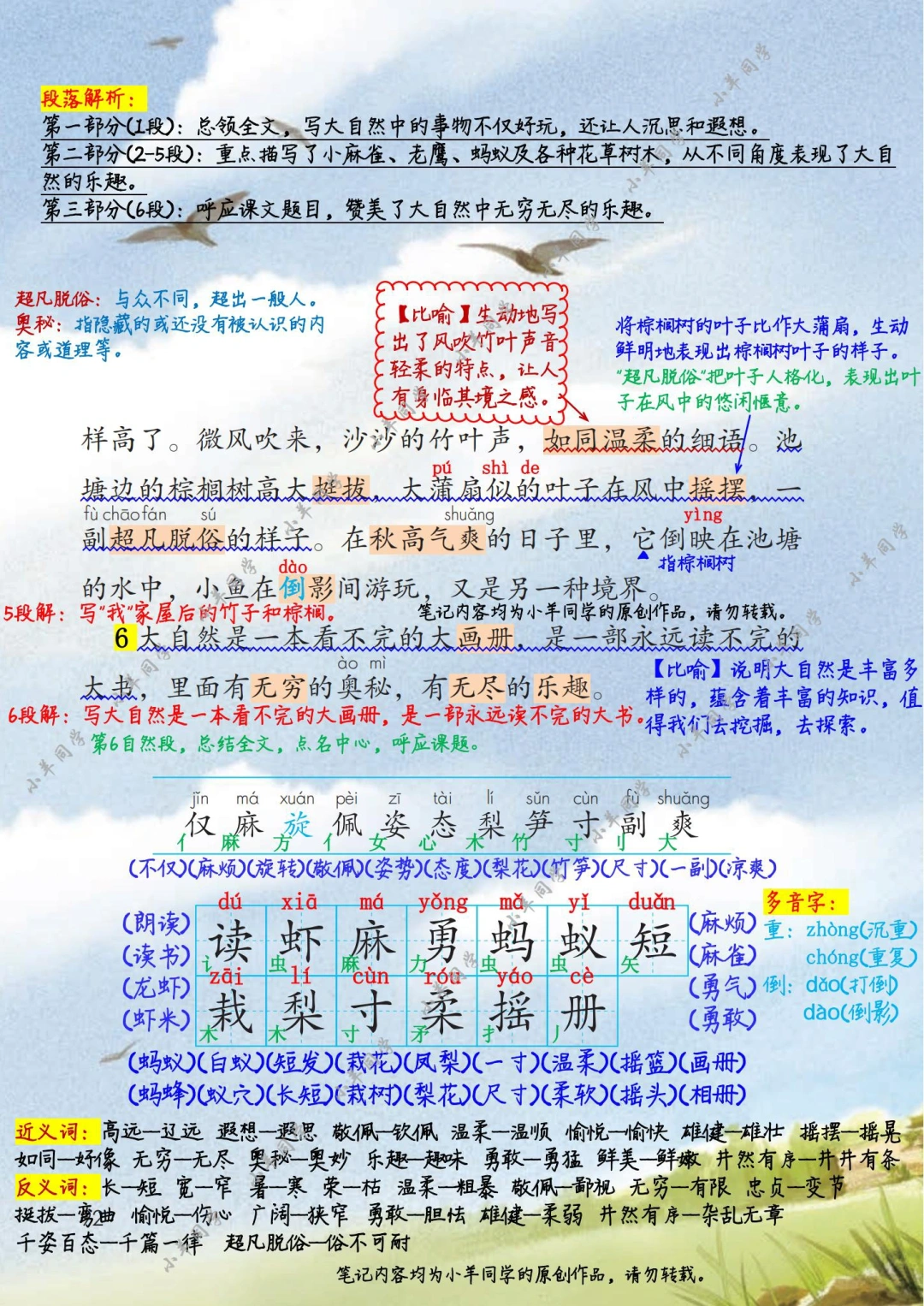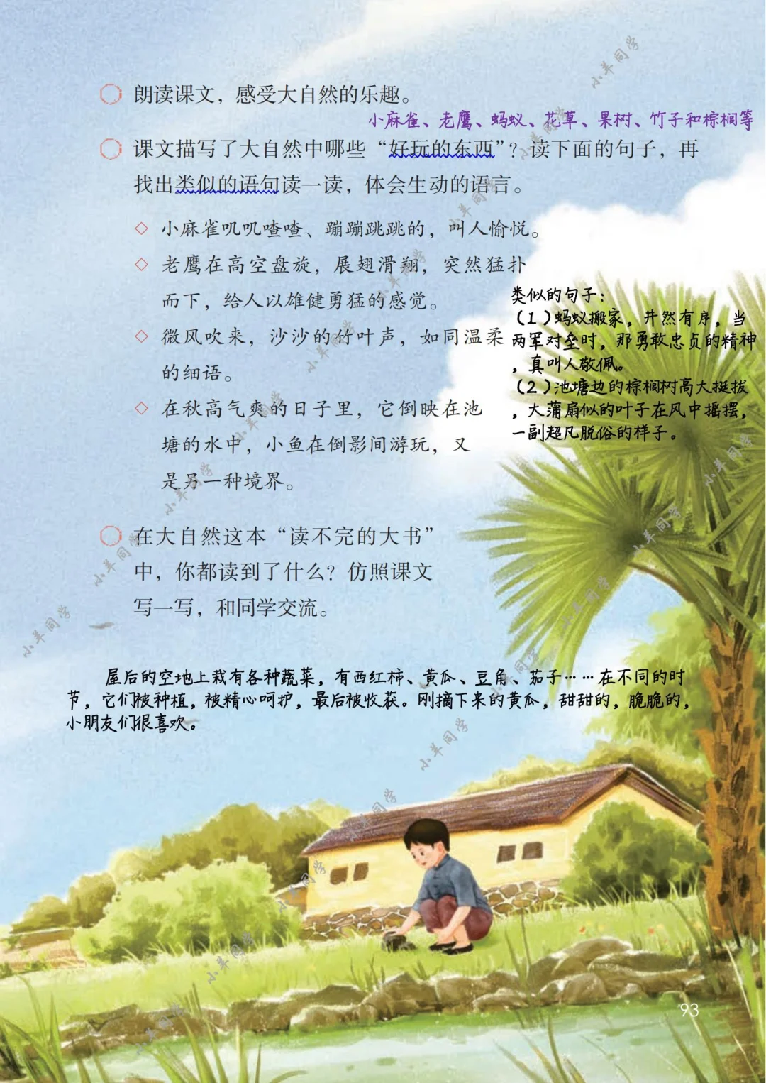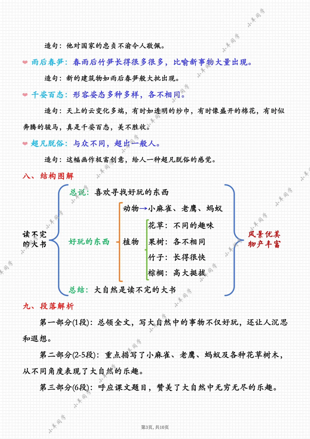 第二部分(2-5段):重点描写了小麻雀、老鹰、蚂蚁及各种花草树木,从不同角度表现了大自然的乐趣。