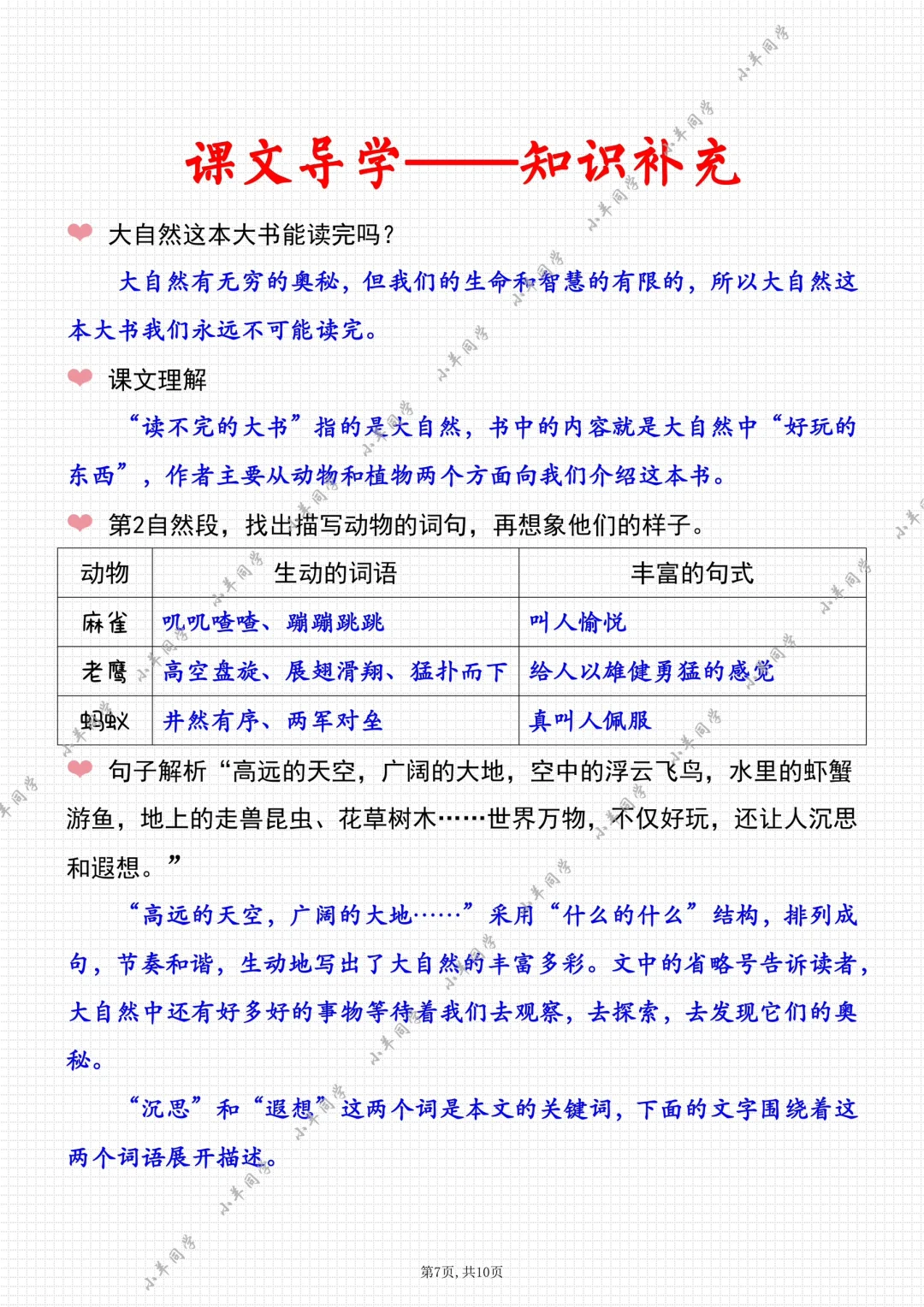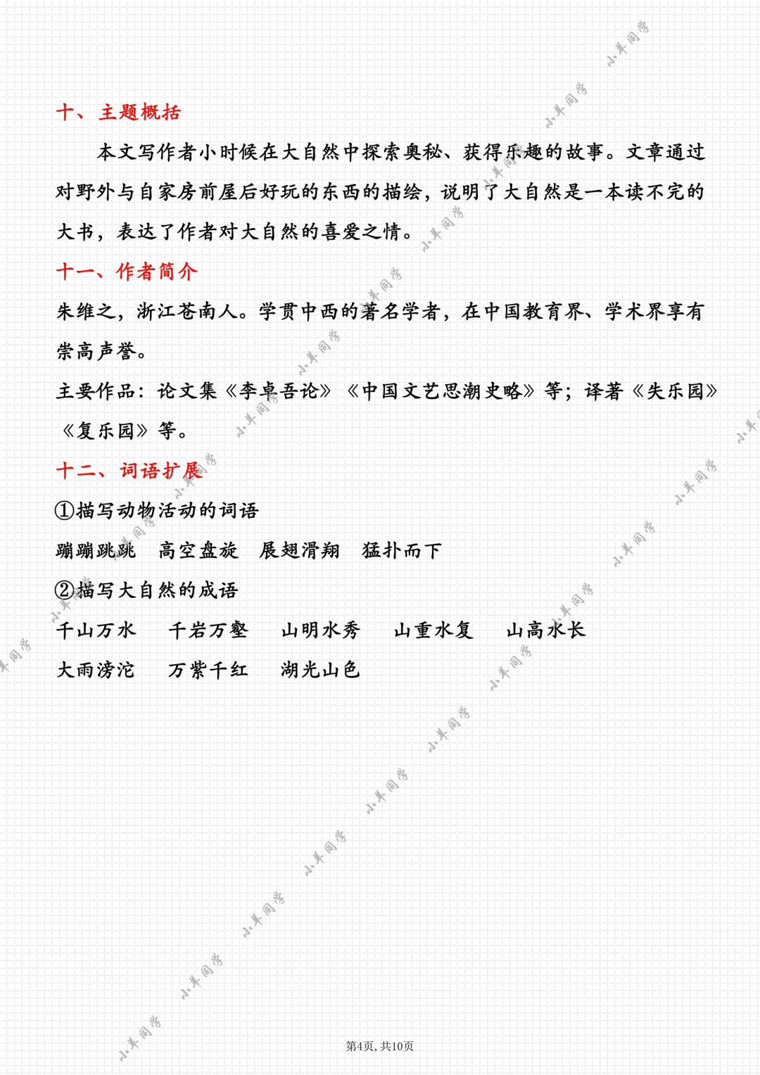 本文写作者小时候在大自然中探索奥秘、获得乐趣的故事。文章通过对野外与自家房前屋后好玩的东西的描绘,说明了大自然是一本读不完的大书,表达了作者对大自然的喜爱之情。