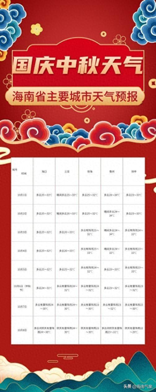 本网站讯(通讯员林俊汝吴春娃郭冬艳)记者今天上午从海南省气象台了解到,预计,国庆、中秋假期期间(10月1日~8日),海南岛天气总体良好,温度适宜,有利于出行和户外活动。