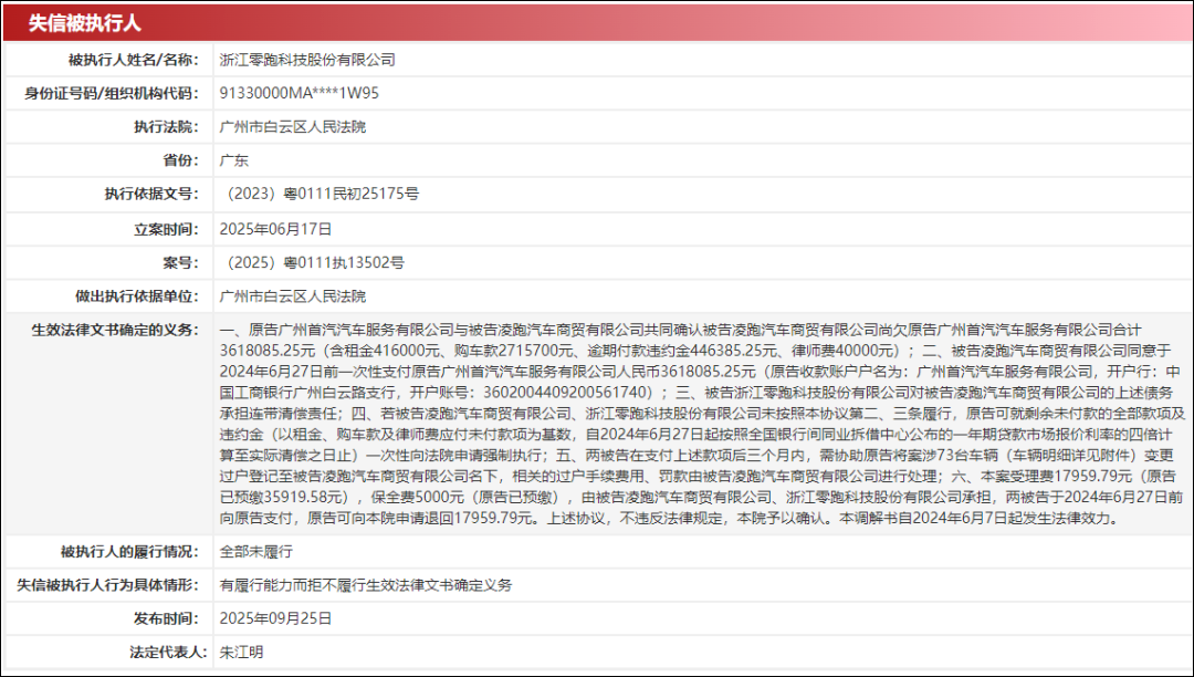 此前,据中国执行信息公开网,9月25日,广东广州市白云区人民法院将浙江零跑科技股份有限公司和其全资子公司凌跑汽车商贸有限公司(以下简称“凌跑汽车商贸”)列为失信被执行人,案号为(2025)粤0111执13502号,执行依据文号为(2023)粤0111民初25175号。