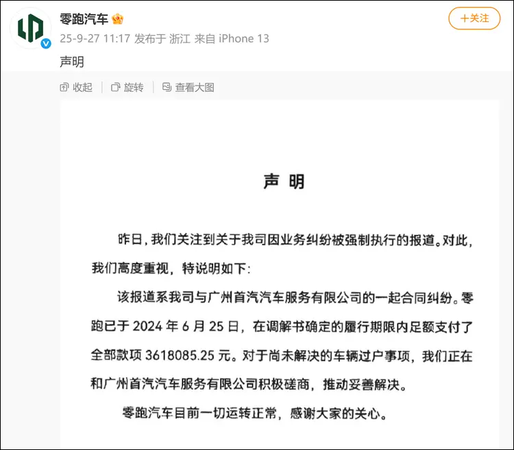 9月27日,零跑汽车发布声明称,关注到关于零跑因业务纠纷被强制执行的报道,系零跑与广州首汽汽车服务有限公司的一起合同纠纷。零跑已于2024年6月25日,在调解书确定的履行期限内足额支付了全部款项3618085.25元。对于尚未解决的车辆过户事项,零跑正在和广州首汽汽车服务有限公司积极磋商,推动妥善解决。零跑汽车表示,目前一切运转正常。