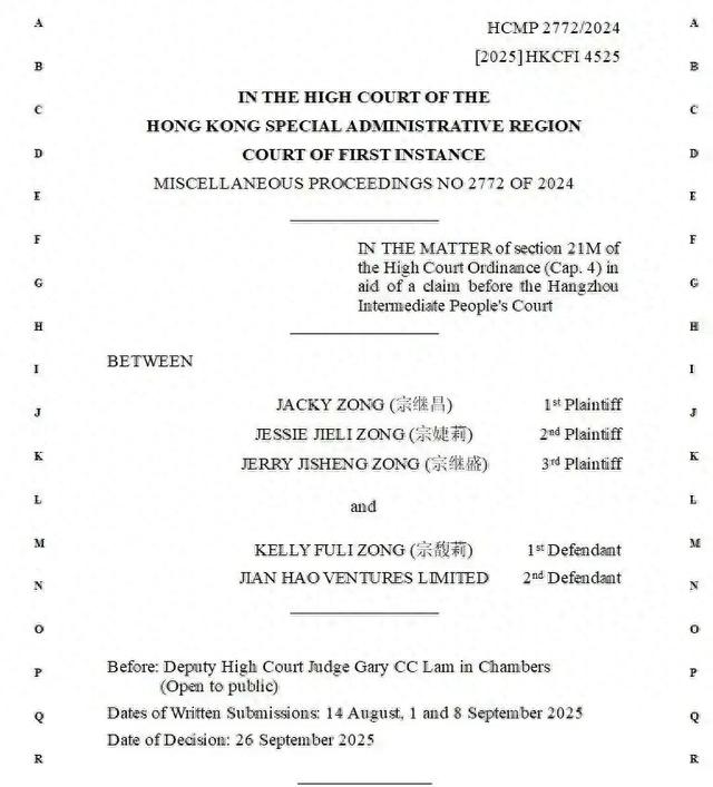 此次聆讯主要围绕被告方(即宗馥莉及JianHao)在8月1日法庭裁决之后提出的上诉申请展开。宗馥莉(宗庆后之女,娃哈哈集团董事长)方不服原裁决,于2025年8月15日提交传票并提出了五项上诉理由,包括法庭此前裁决所依据的香港《高等法院条例》第21M条是否适用、原告应先向内地法院申请类似救济、原告不存在可争辩的信托或财产权益、香港法院无需发出禁制令来提供担保,以及香港法院的披露令范围过宽且不适当等问题。