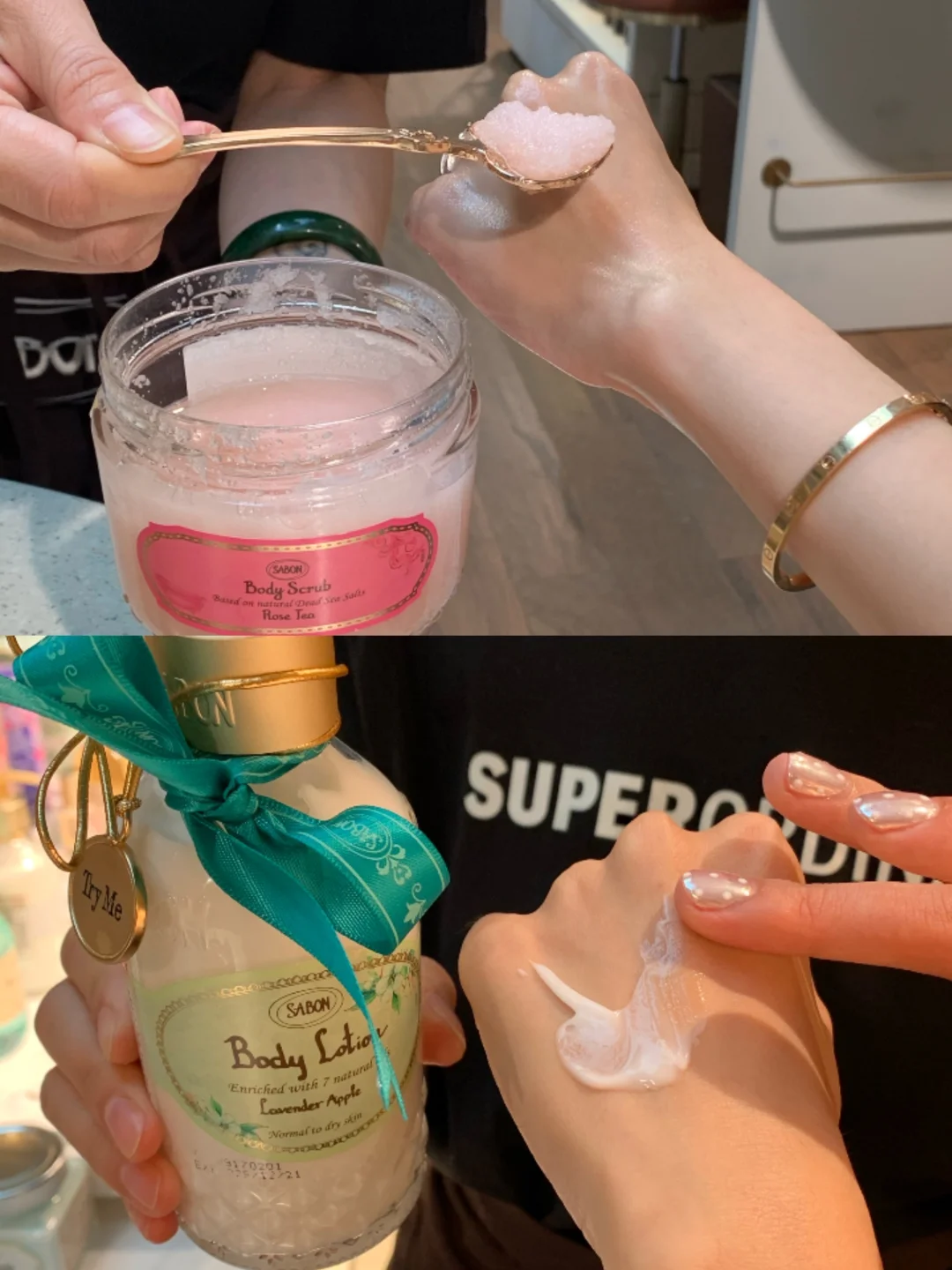 用磨砂膏+沐浴油洗手 店员还贴心的帮我