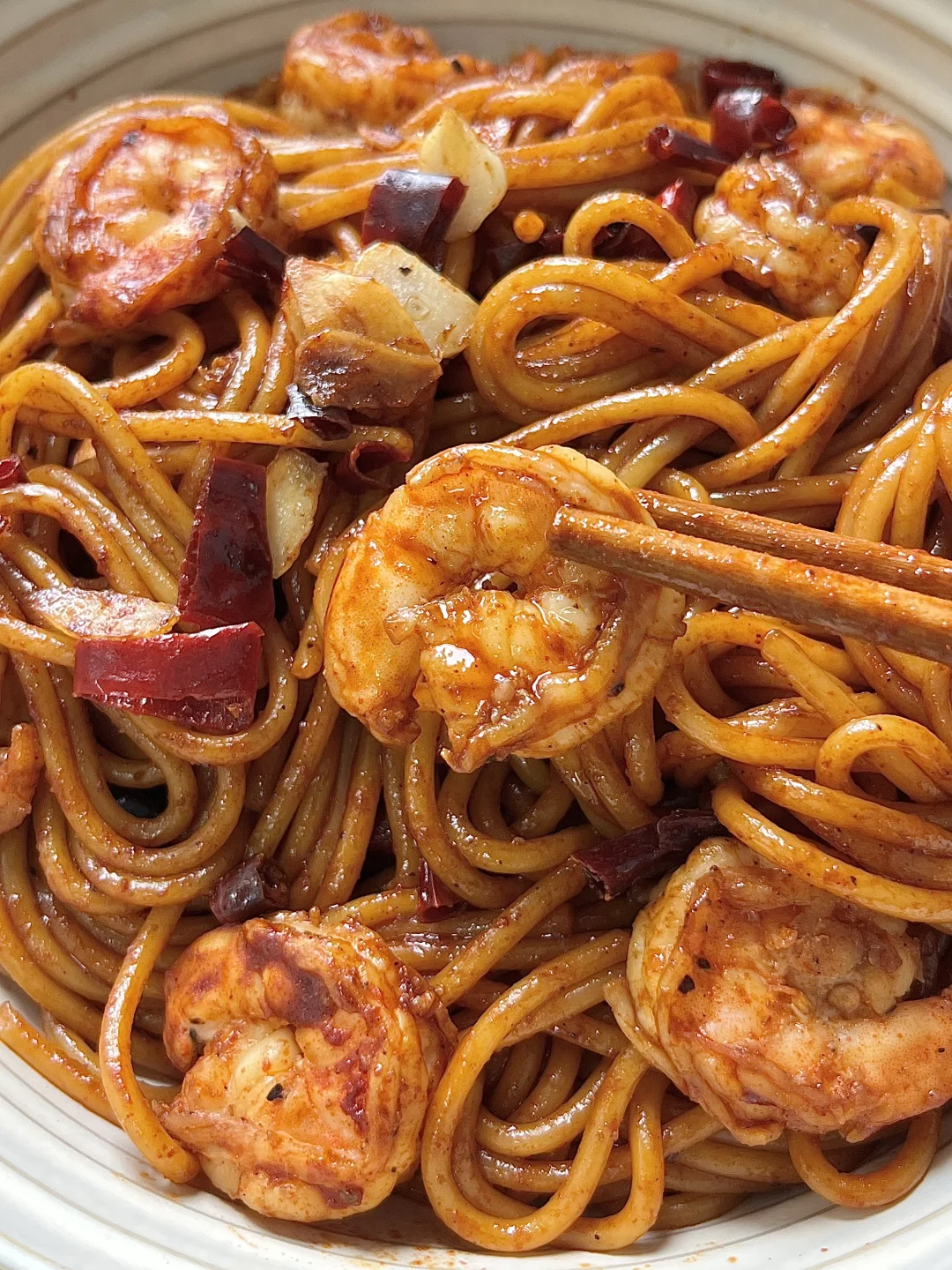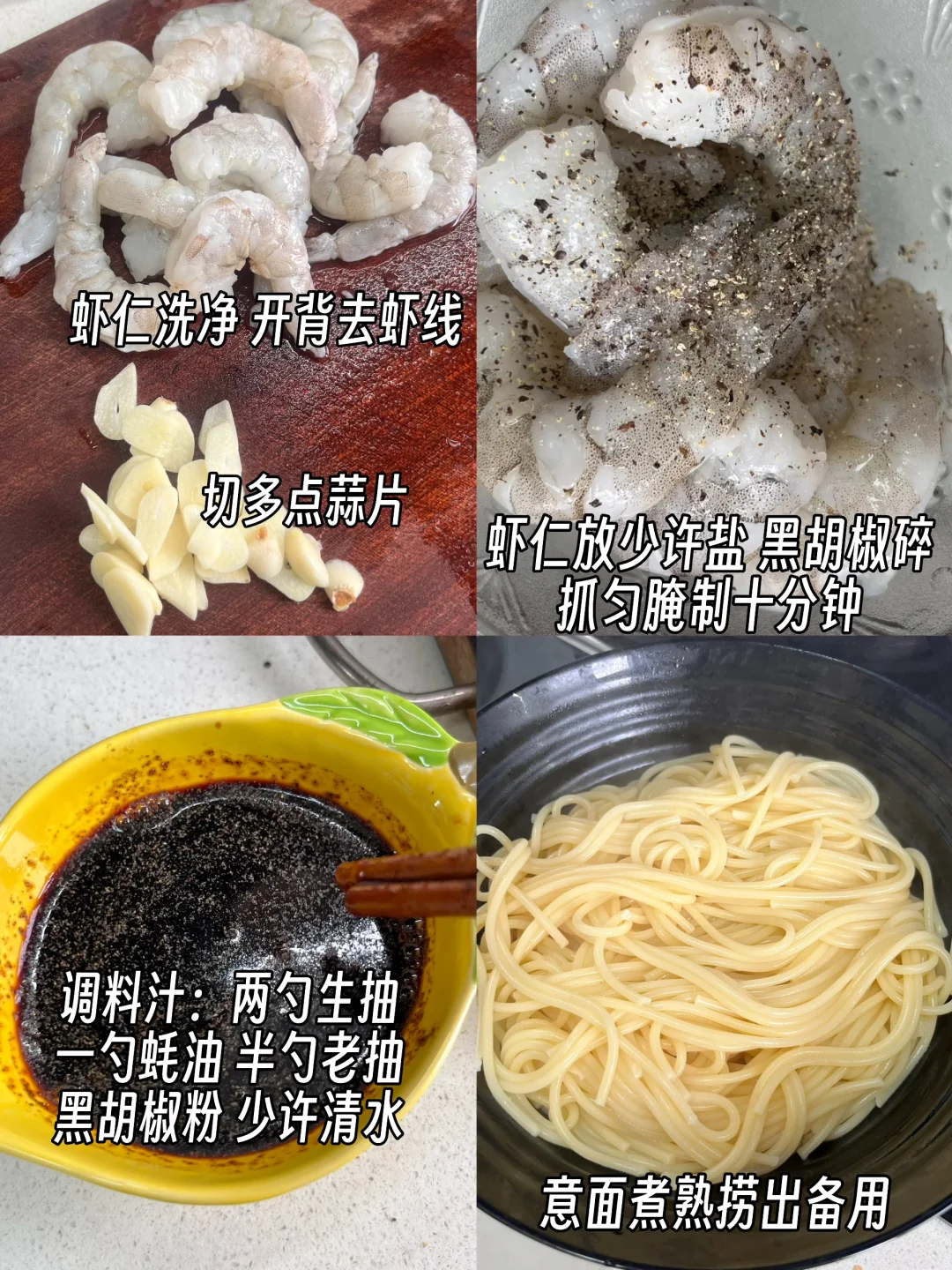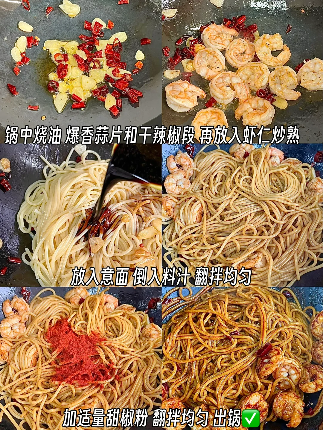 附做法: 1️⃣虾仁洗净,开背去虾线;多切点蒜片备用;虾仁中放少许盐和黑胡椒腌制十分钟 2️⃣调料汁:两勺生抽、一勺蚝油、半勺老抽、黑胡椒粉、少许清水;意面煮熟捞出备用 3️⃣锅中烧油,爆香蒜片和干辣椒段,放入虾仁炒熟,再放意面、淋入料汁 4️⃣放适量红甜椒粉(有淡淡的烟熏味道很好吃😋),翻拌均匀出锅✅ -