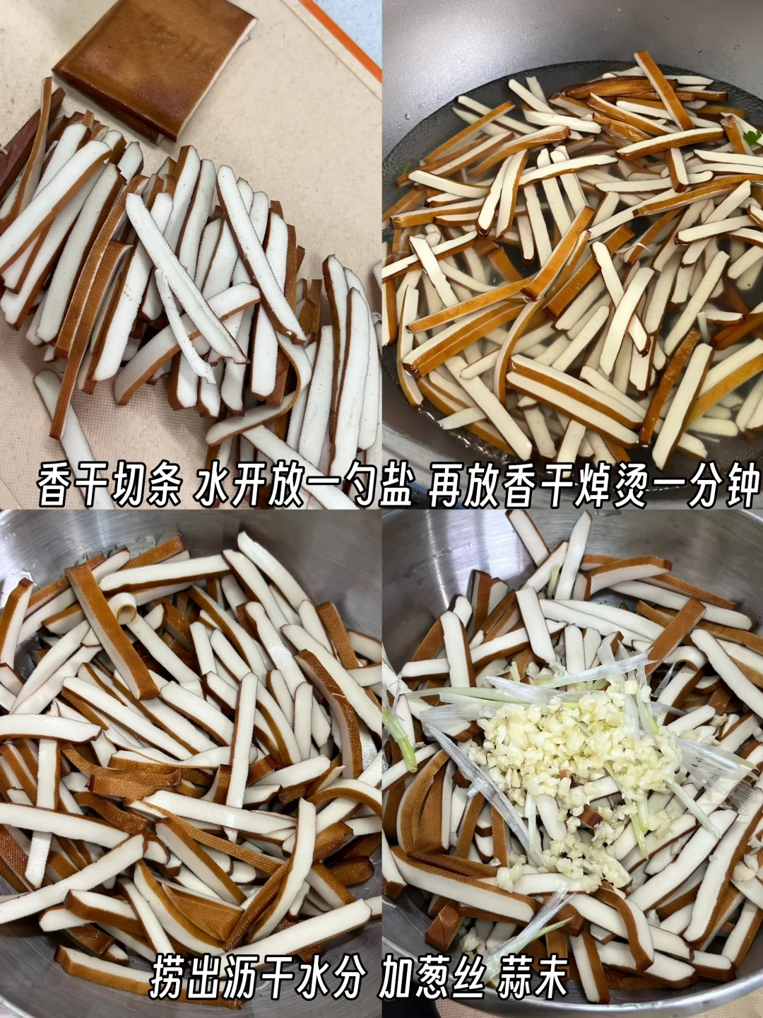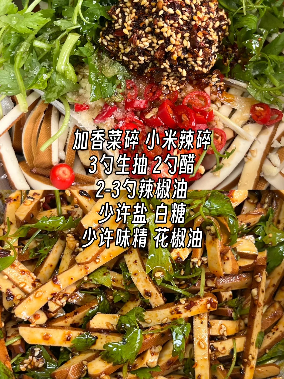 附做法: 1️⃣香干切成条,水开放一勺盐,下香干焯烫一分钟,捞出控干水分 2️⃣放葱丝、蒜末、小米辣碎、香菜碎,再放:三勺生抽、两勺醋、2-3勺辣椒油、少许盐、白糖、少许味精、花椒油 -