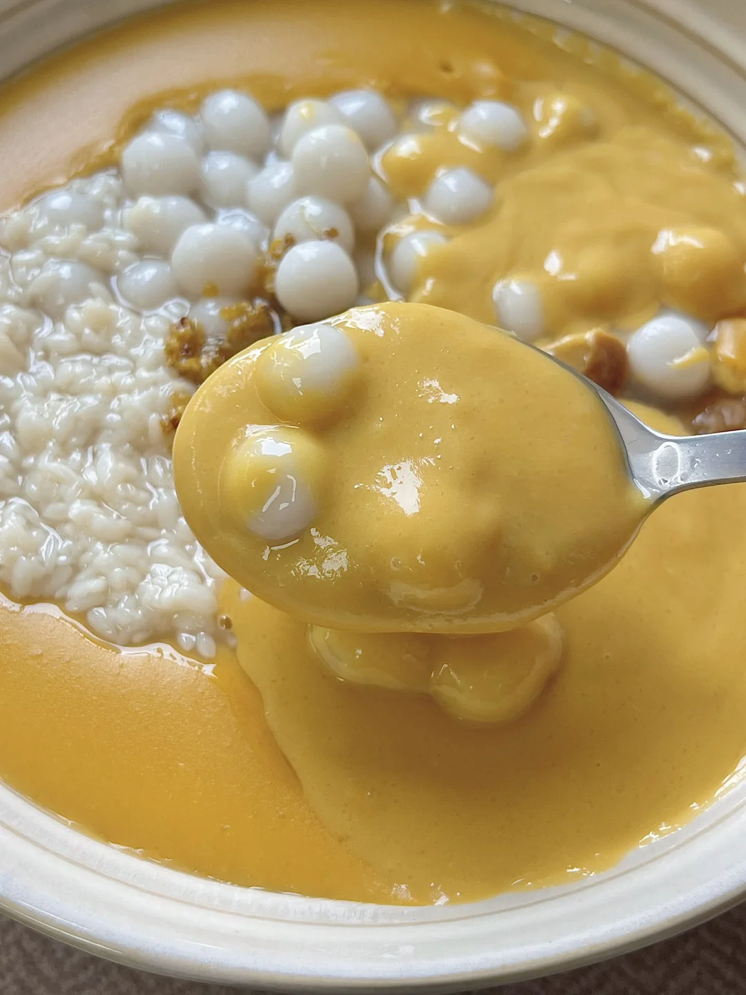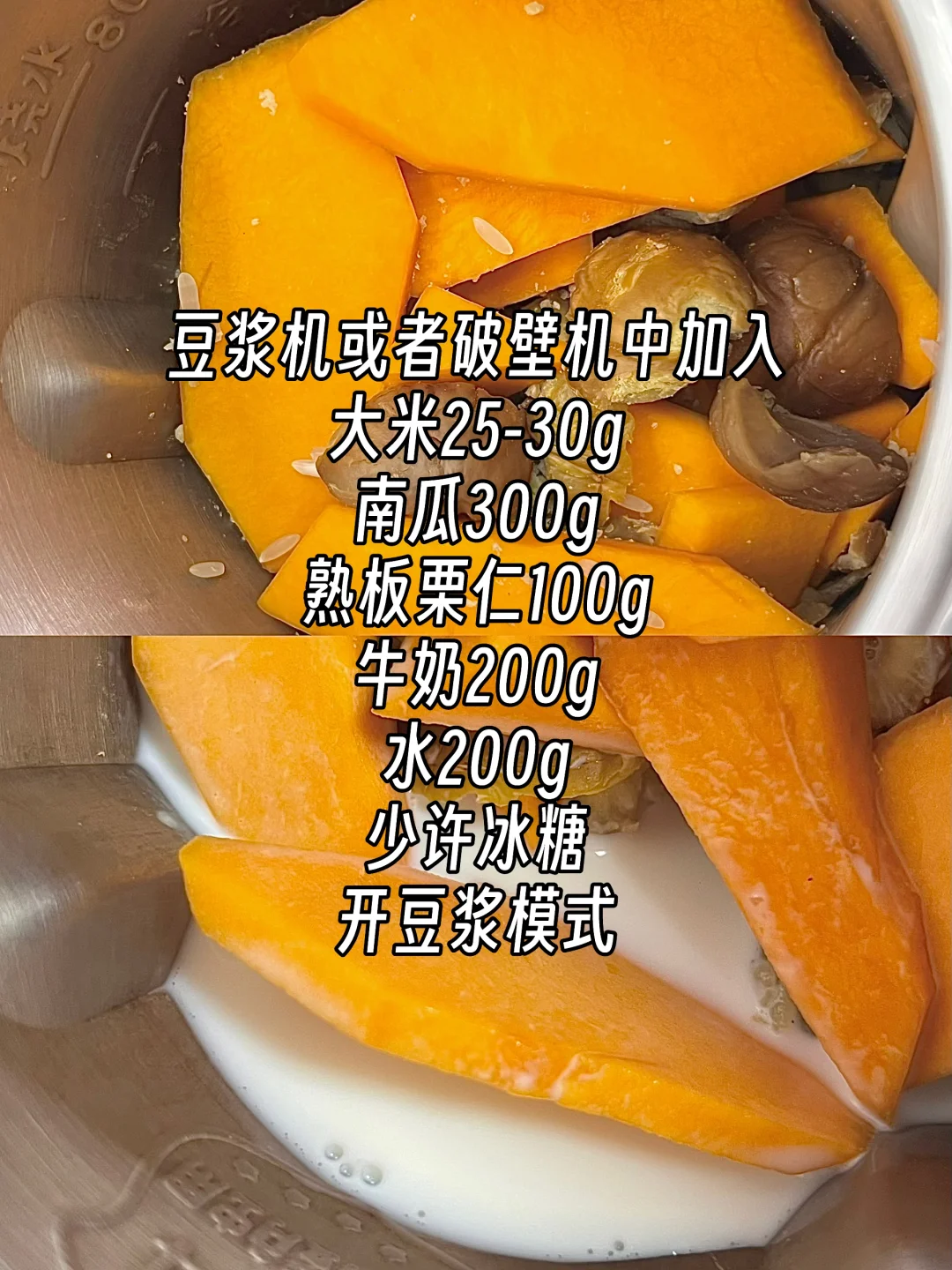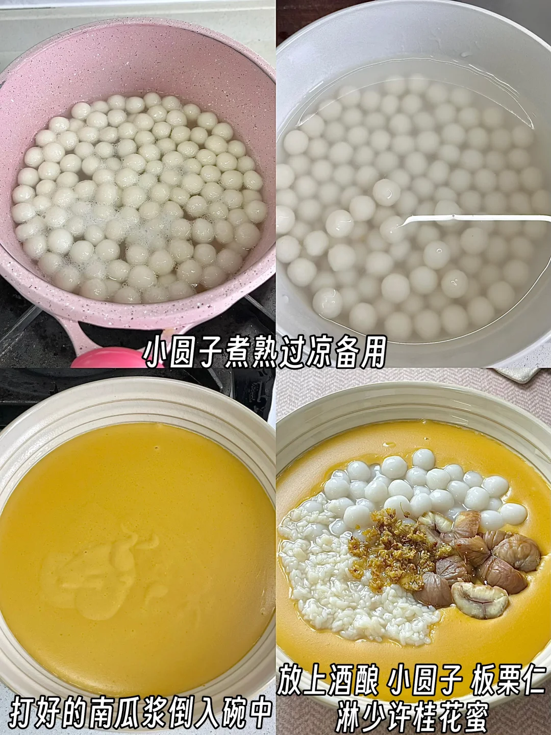 附做法: 1️⃣豆浆机或者破壁机中放:大米25-30g、南瓜300g、熟板栗仁100g、牛奶200g、水200g、少许冰糖,开豆浆模式 2️⃣小圆子煮熟,捞出过凉备用;碗中倒入打好的南瓜浆,放酒酿、小圆子、板栗仁、淋少许桂花蜜✅ -