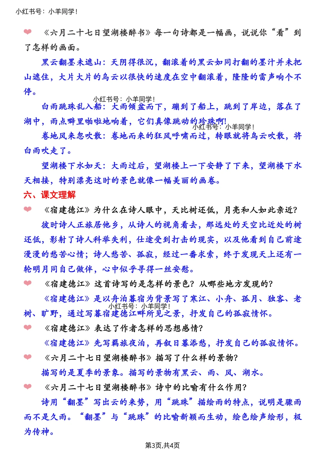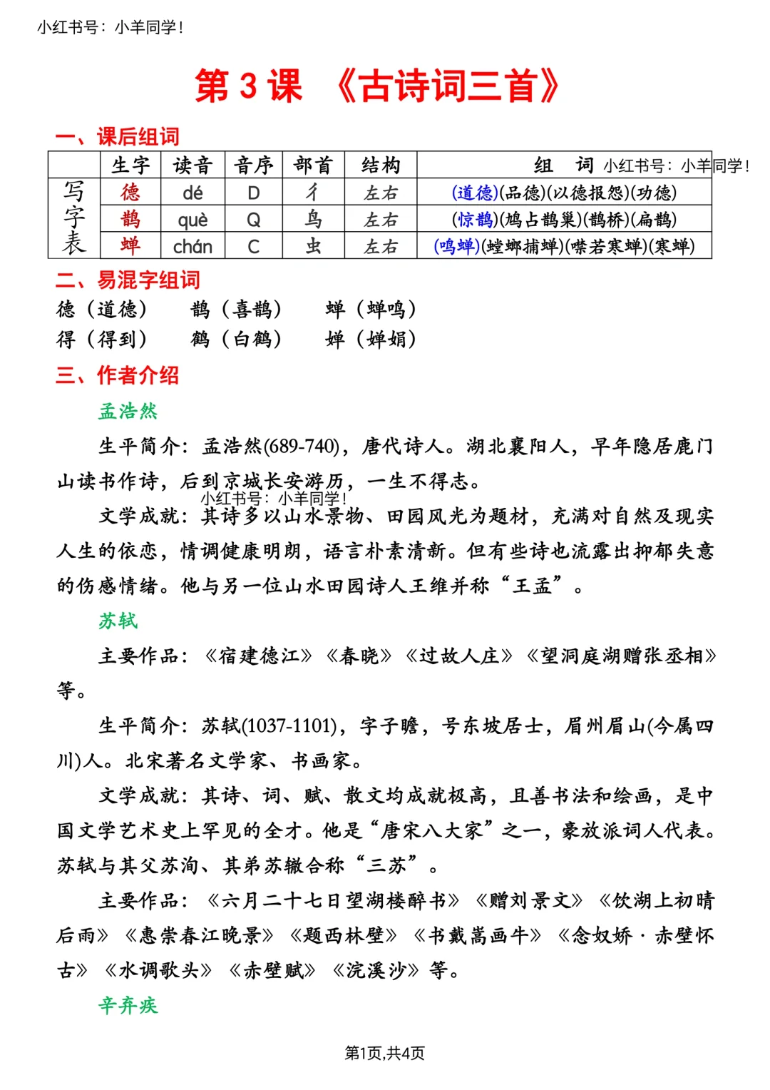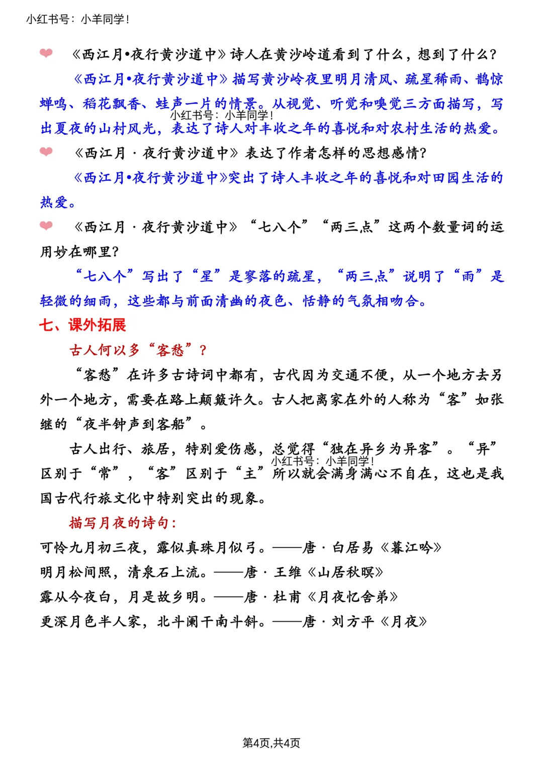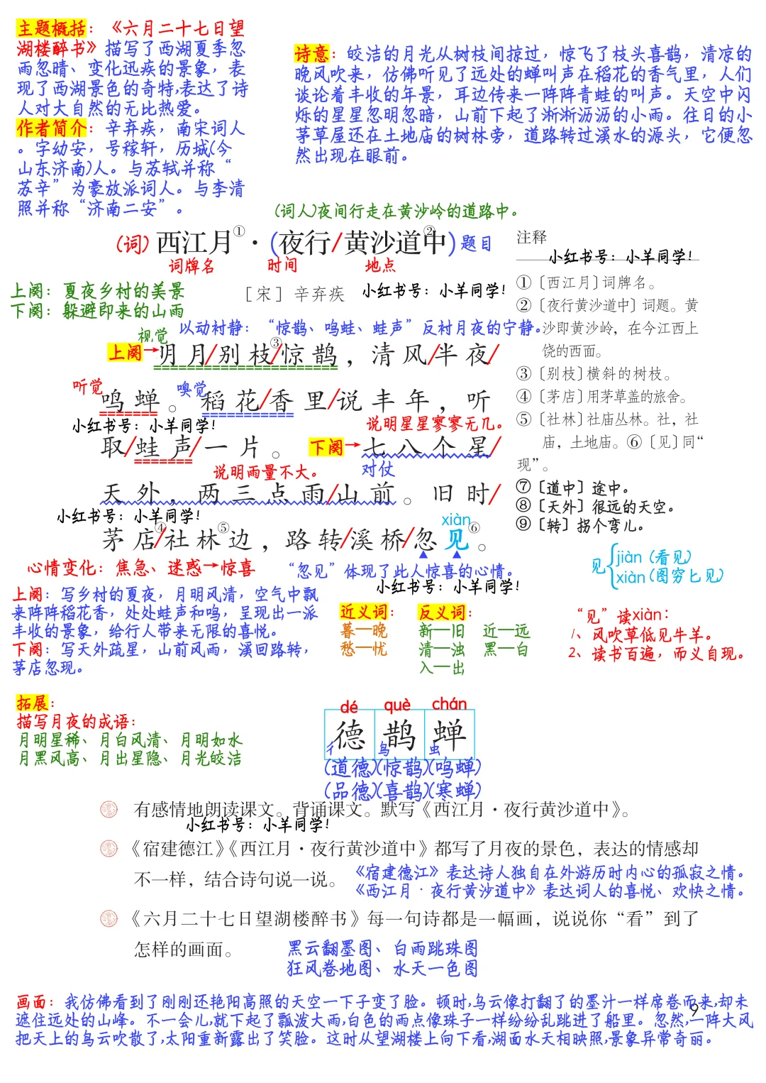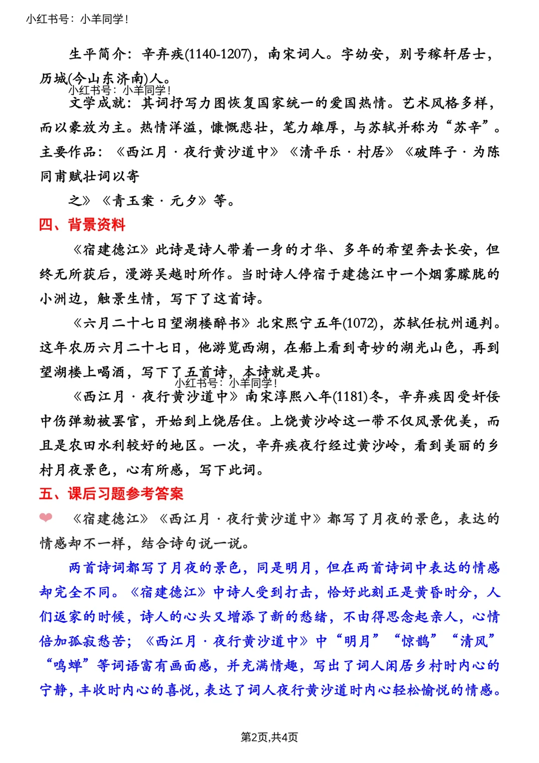 🌻 学习目标: 🔺会写“德、鹊、蝉”3个字。 🔺有感情地朗读课文。背诵课文。默写《西江月·夜行黄沙道中》。 🔺借助注释理解诗意,发挥想象,说出诗句描绘的画面。(重点) 🔺由所读的内容想开去,体会《宿建德江》西江月·夜行黄沙道中》表达的不同情感。(难点) 🔺店铺可以获取电子版。
