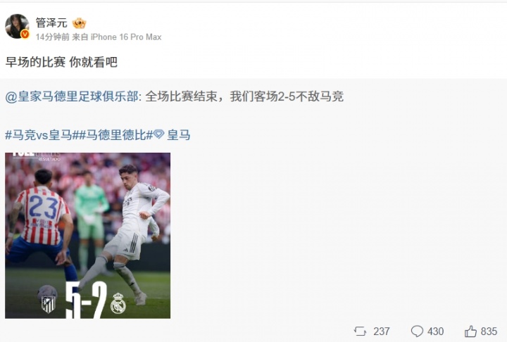 对此皇马铁粉管泽元更博吐槽:早场的比赛你就看吧