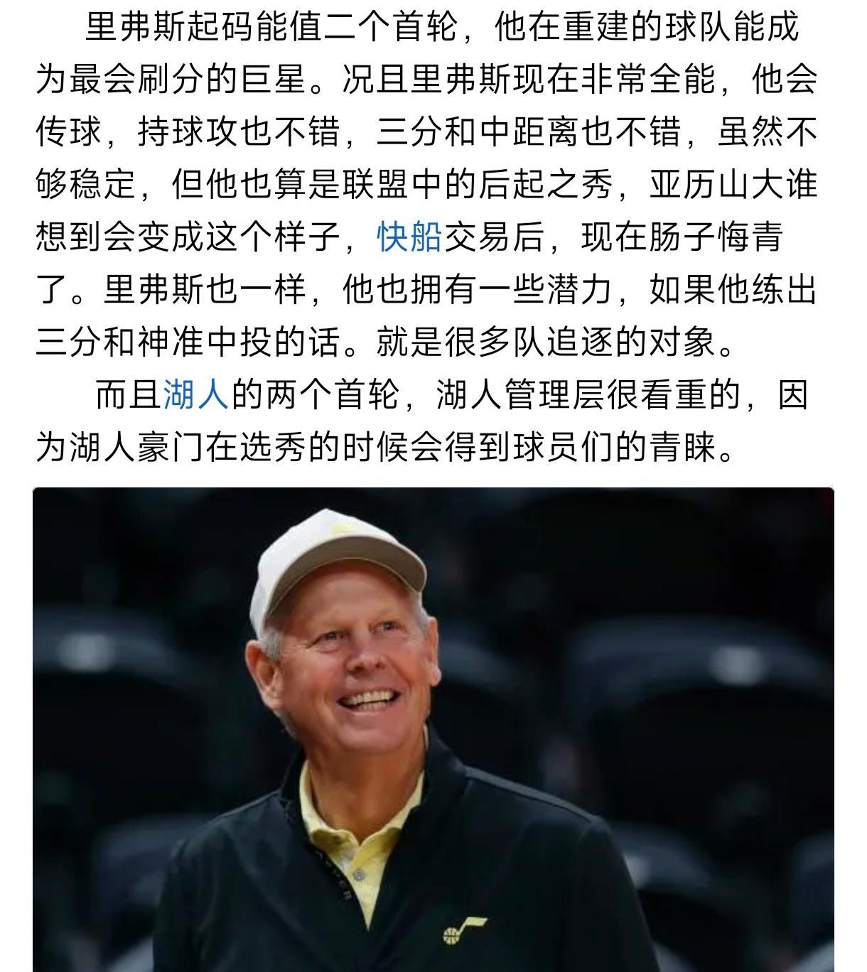 小里弗斯根本不具备很高的交易价值。 小里弗斯加两个首轮的价值, 虽说看上去市场价值很高, 却真换不来什么好东西。 听说安吉换凯斯勒要价小里弗斯加两首轮, 湖人没有两个首轮只有克内克特加1个首轮, 小里弗斯虽说能控球能传球, 但是防守太差还是持球大核打法, 只能去弱队刷数据, 强队根本不需要他这种后卫, 克内克特身价已经被佩林卡搞没, 关键是弱队也没有湖人需要的筹码。 真正的问题是凯斯勒不同意续约, 就是就算去湖人明年也要进去自由市场, 这对于湖人肯定是不能接受的。