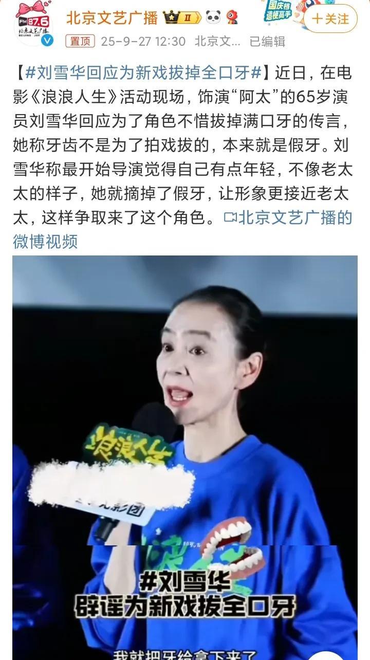 65岁刘雪华,辟谣了! 9月27日,知名演员刘雪华否认“为了演戏拔掉满口牙”的传闻,表示本来就是假牙,只是为了打动导演拿到角色,让形象更接近老太太,才拿掉了假牙,因为一开始导演觉得她有点显年轻,并不是很符合角色。 有网友说,用膝盖想都知道不可能为了演戏拔牙,其实为了演戏削骨都有,更别提是拔牙了,比如安妮海瑟薇拍摄《悲惨世界》时为了贴近19世纪欧美底层为生活所迫拔牙制作假牙的陋习,就拔了一颗臼齿;比如斓曦出演《甄嬛传》里眉庄时因为导演觉得她有虎牙不符合角色端庄气质时她就拔了; 当然,演员为了某个角色拔几颗牙这种事常有,但是拔掉满口牙,人类世界自从诞生影视剧以来都没听过。