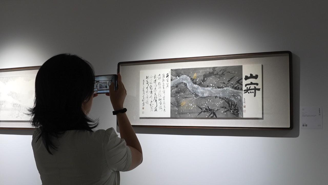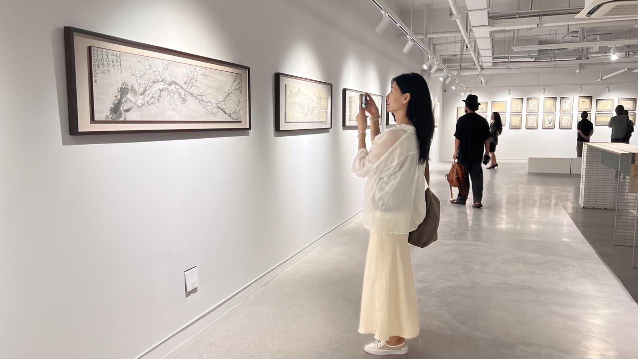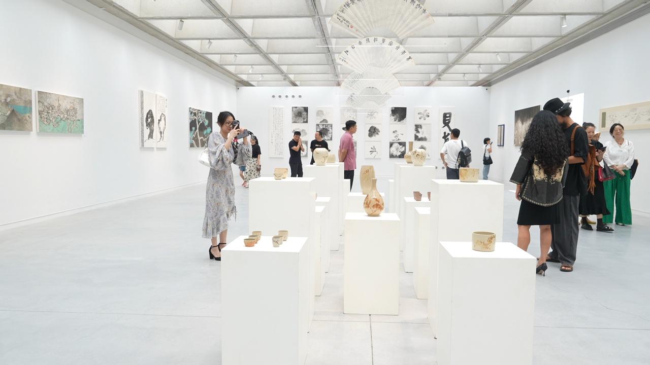 走进展厅,映入眼帘的是“见花”系列作品,18幅水墨画以自然朴素的笔触传递着鲜活的生命力;随后展出的山水画作,则延续了艺术家对自然意象的深层探索。展厅内观众三五成群,驻足交流。位于展厅中心设计尤为引人注目,折扇轻悬,其下陈列着本地非遗瓯窑,吸引不少艺术爱好者细细观赏。