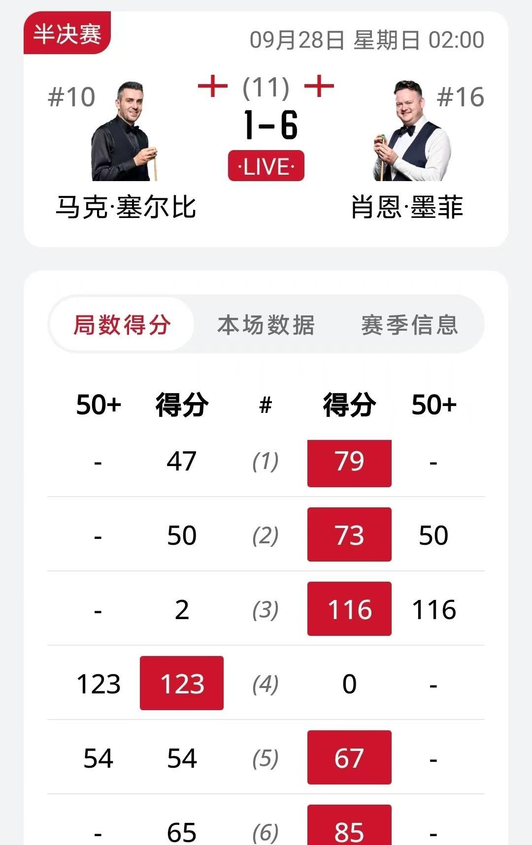 肖恩-墨菲6:1轻取塞尔比,晋级英国公开赛决赛。今晚8:00,他将与麦克吉尔争夺冠军,决赛赛制是19局10胜,分两个阶段进行。 虽然比分差距有点大,但是进程还是比较激烈的。赛大师有四局球,都是局面比较胶着的情况下被逆转了,这在以往的比赛中并不多见。如果能够把握其中的两局,比赛的结果也不一定。 从这个系列赛看下来,赛大师今年下滑了很多。尤其是长台,不到50%的成功率,这让他的杀伤力至少打了7折。上一轮与马克-威廉姆斯的比赛时多次打丢袋口球,甚至多次打丢手摆位底袋,实在是让人唏嘘不已。估计赛大师现在已经体会到丁俊晖的那种有心无力感了,75三杰开始退化了,没想到80五虎之首比他们退化的还要更早一些。