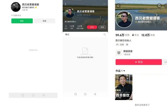 左图为贾国龙视频号,中间为其小红书账号,右图为其抖音账号。