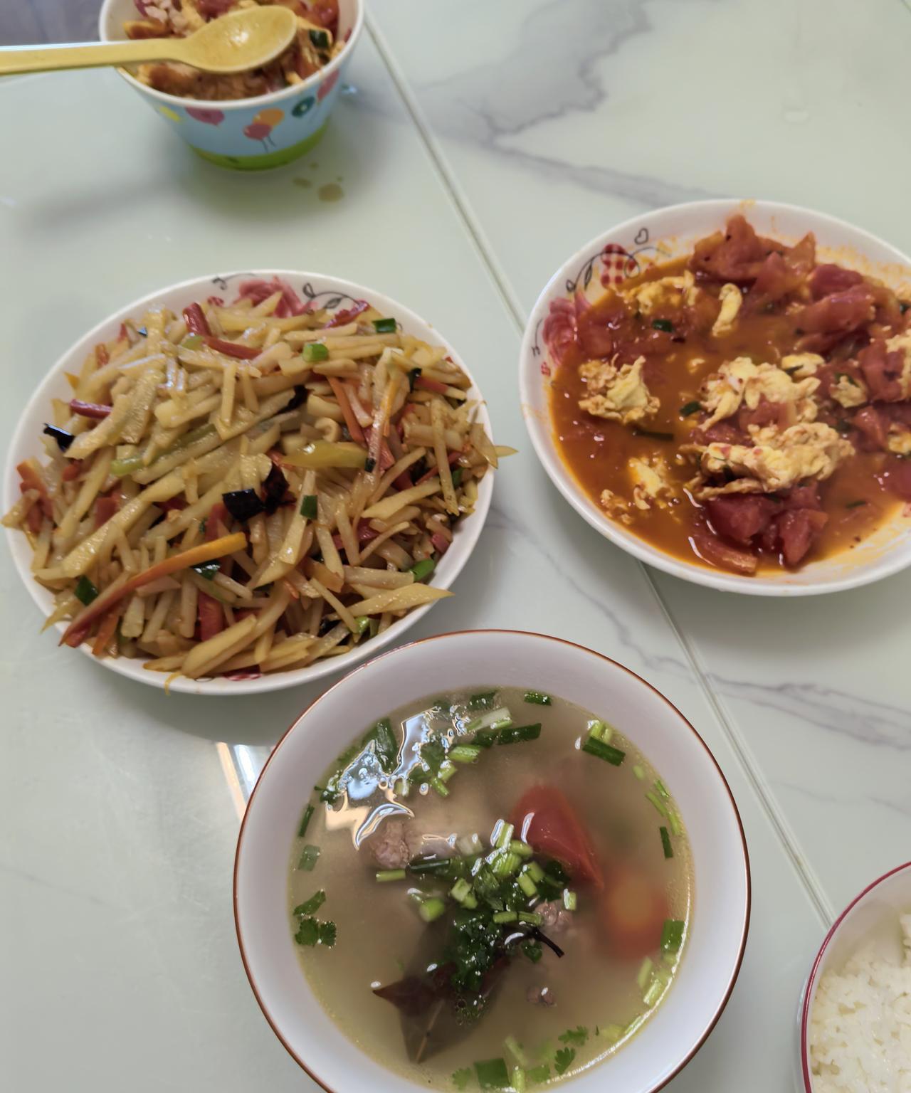 这是我中午做的饭,一个西红柿炒鸡蛋,一个酸辣土豆丝,一个排骨汤,婆婆说,好吃是好吃,就是太辣了,大人能吃,小孩吃不了,好吧没想到!