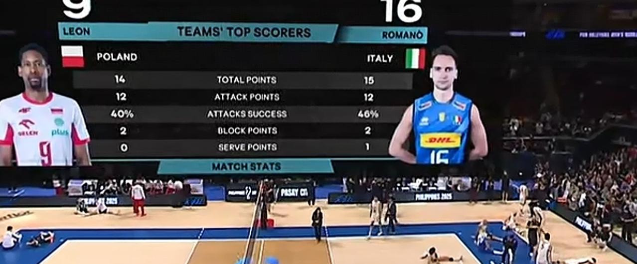意大利男排3:0干净利落赢了波兰男排,挺进世锦赛决赛! 意大利男排场上进攻点多,替补队员实力不弱,上场就能发挥作用,全队队员个体实力都挺强。 意大利男排第三局局末复制了第二局换上9号队员发球的程序,9号队员发球也照例没有辜负教练的信任,帮助球队扩大了比分优势。 波兰男排进攻点比较集中,莱昂是主要得分点。 整场比赛罗马诺得分15分,其中进攻12分、拦网2分、发球1分。 莱昂得分14分,其中进攻12分、拦网2分。 期待明天精彩的比赛!
