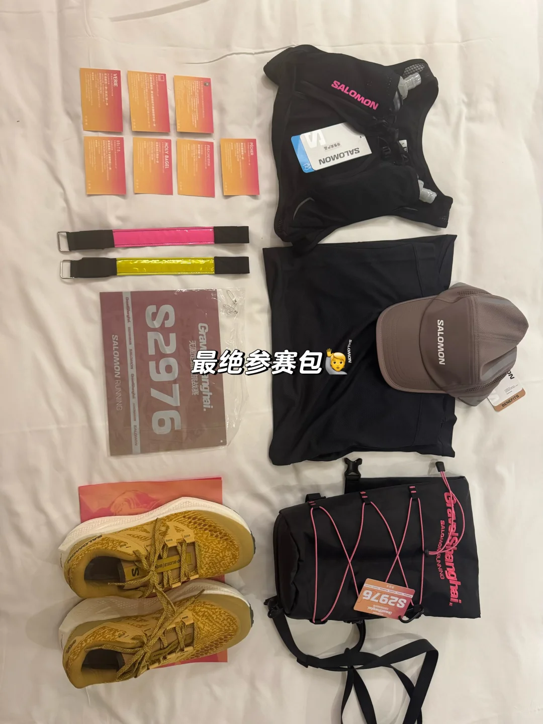 [皱眉R]刚刚领到明天的参赛包,包里的物资真的好用心。一件跑步背包,一件黑t,两个手环,还有7张可以去在打卡点免费领取食物的通用货币卷,一张打卡地图,夜光号码簿。哦对了还有参赛包本包!真的好好看!