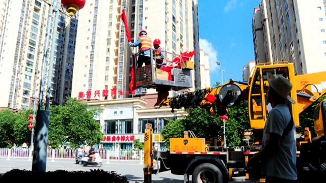 在建业大道、渝邻大道等路段,工作人员借助高空作业车,细致地将国旗固定在路灯杆上,并反复调整角度,确保整齐划一。阳光映照下,红旗迎风轻展,整条街道仿佛披上了“红色铠甲”,吸引不少市民驻足留影。
