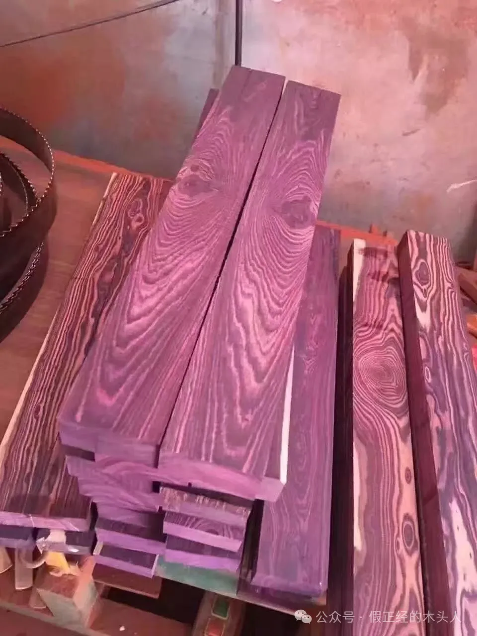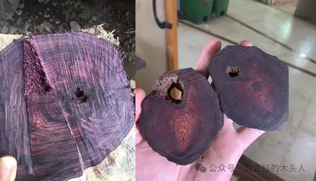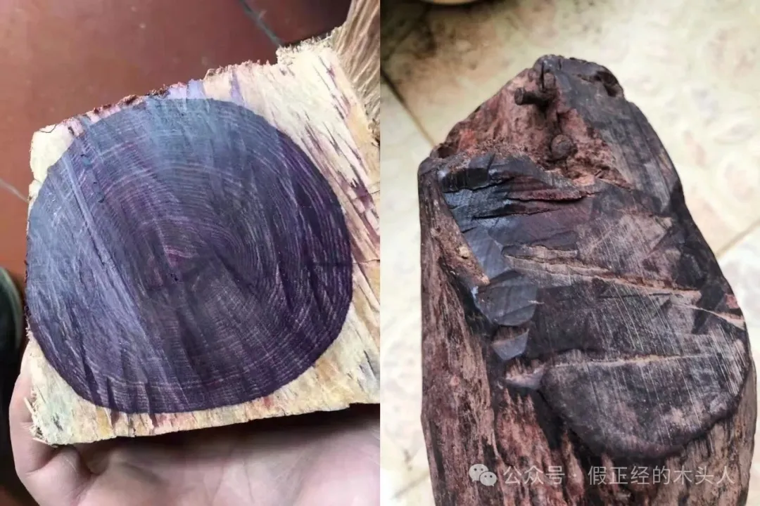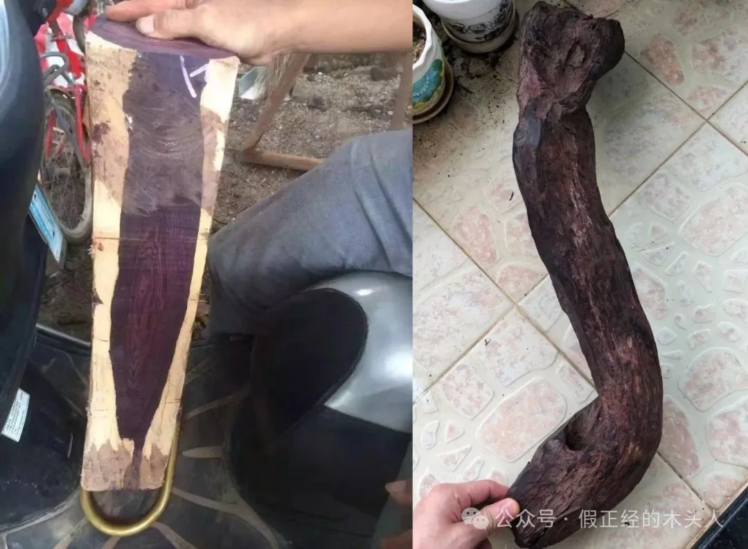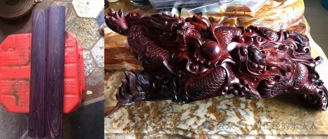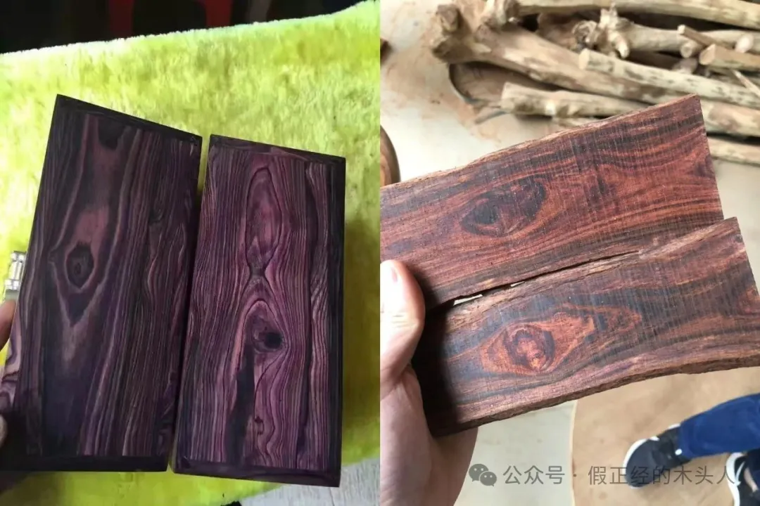 2、紫花梨和海南黄花梨原材料切片此处可明显观察到底色差异,左边紫花梨呈现高饱和紫色,右边海南黄花梨则以褐黄底为主+偏黑色纹理。