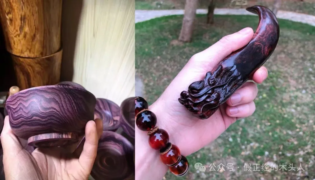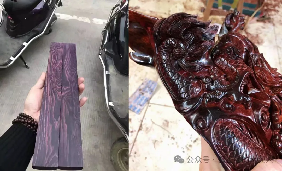 4、紫花梨和海南黄花梨沉水紫油梨成品可明确观察到,左边紫花梨镇尺呈现高饱和的、明确的紫色,右边海南黄花梨沉水紫油梨雕件则以褐色+黑色为主,底色差异明显。
