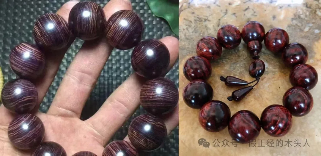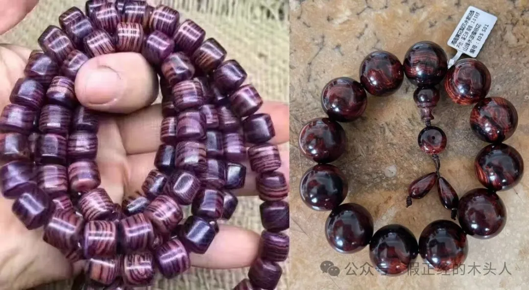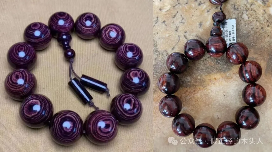6、紫花梨和海南黄花梨沉水紫油梨手串左边紫花梨表达明确紫色/紫药水晕染的脏色,右边海南黄花梨则为褐色+黑色。