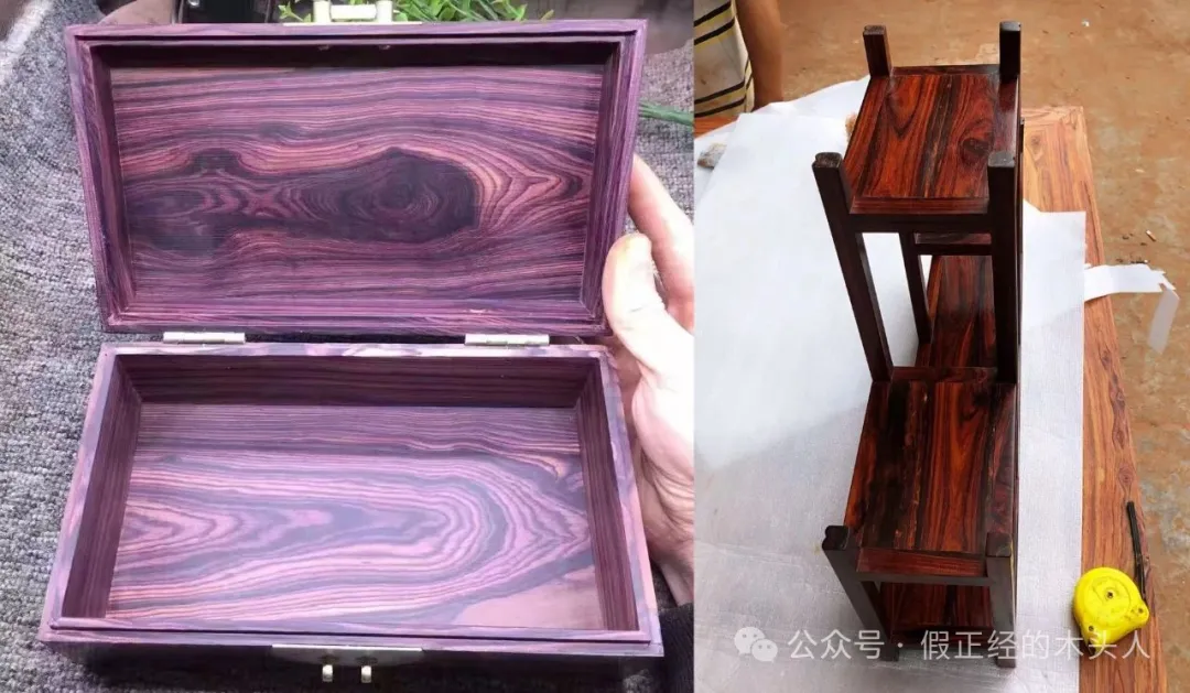 3、紫花梨和海南黄花梨紫油梨成品可明显观察到底色差异,左边紫花梨盒子在自然光下呈现明确的类似紫药水晕染的紫色,右边海南黄花梨紫油梨成品则表达出深褐色。