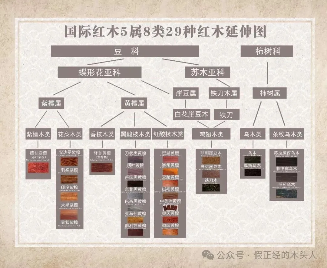 (资料源于百度百科)海南黄花梨:豆科—蝶形花亚科—黄檀属—香枝木类—降香黄檀两者科属相同,最后类目不同,故品相虽相近,但细节还是有明显差异。目前市面上仿冒木种,在国标内的,基本都是黄檀属。可见国际红木5属8类29种红木示意图。(注1:香枝木类就只有海南黄花梨一种,属独立品类。)(注2:在国标红木中的材料,均可经专业检测机构检测出具体品种。)