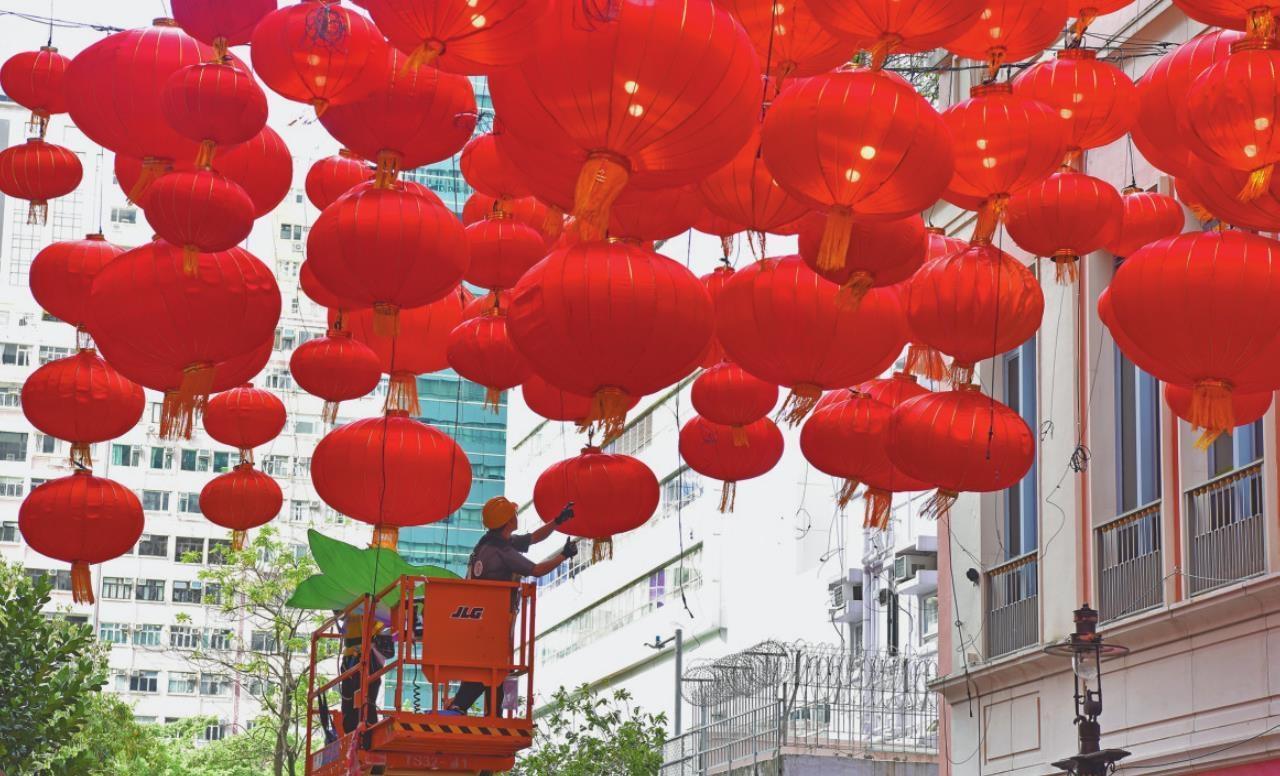 9月28日,工作人员在香港利东街悬挂大红灯笼。随着国庆、中秋的临近,香港街头张灯结彩。新华社记者陈铎摄