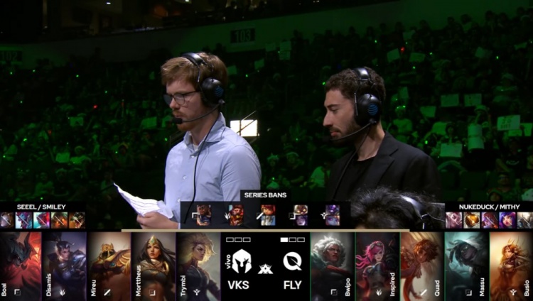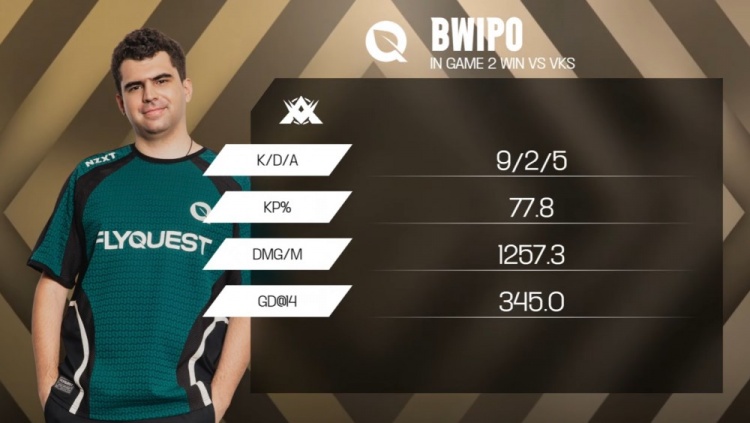 第一局前期双方稳健发育,VKS先拿三虫,随后Morttheus卡莎Uzi附体野区双杀,先锋团Busio牛头开大吃满伤害,Bwipo奎桑提冲锋1v3掩护Massu飞机爆轰三杀,FLY瞬间拿到3K经济优势。
