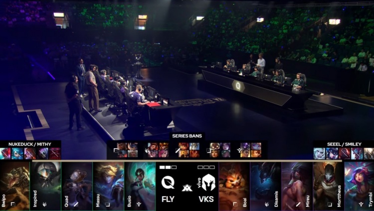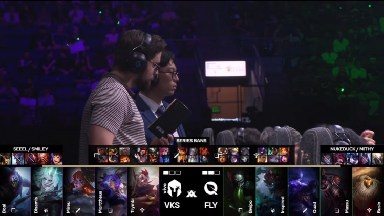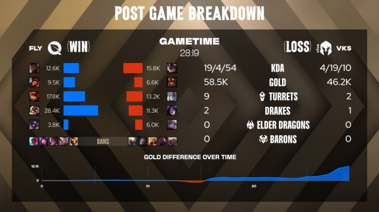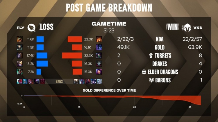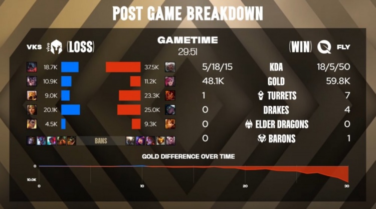 中期VKS找机会中路抓掉Massu飞机但Morttheus卡莎被换,FLY四人顺势入侵VKS野区打出1换2。厄塔汗团战,VKS不堪一击,Trymbi波比抡大锤被Bwipo奎桑提打断,FLY追击到VKS下路高地塔之前打出1换4,回头拿到厄塔汗,经济领先5k。