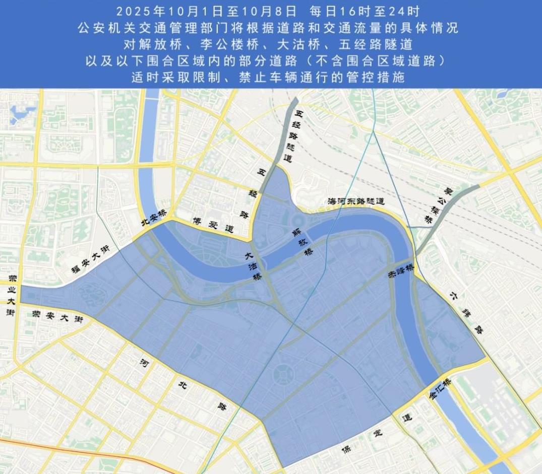 2025年国庆中秋假期,为强化解放桥、金街、五大道及海河沿线区域的道路交通管理,保障出行高峰时段道路交通安全、有序、畅通,天津依据《中华人民共和国道路交通安全法》等法律法规,决定对本市部分区域实施临时交通管控措施。此举彰显了天津这座城市好客与人文关怀的一面。 具体内容见下图信息