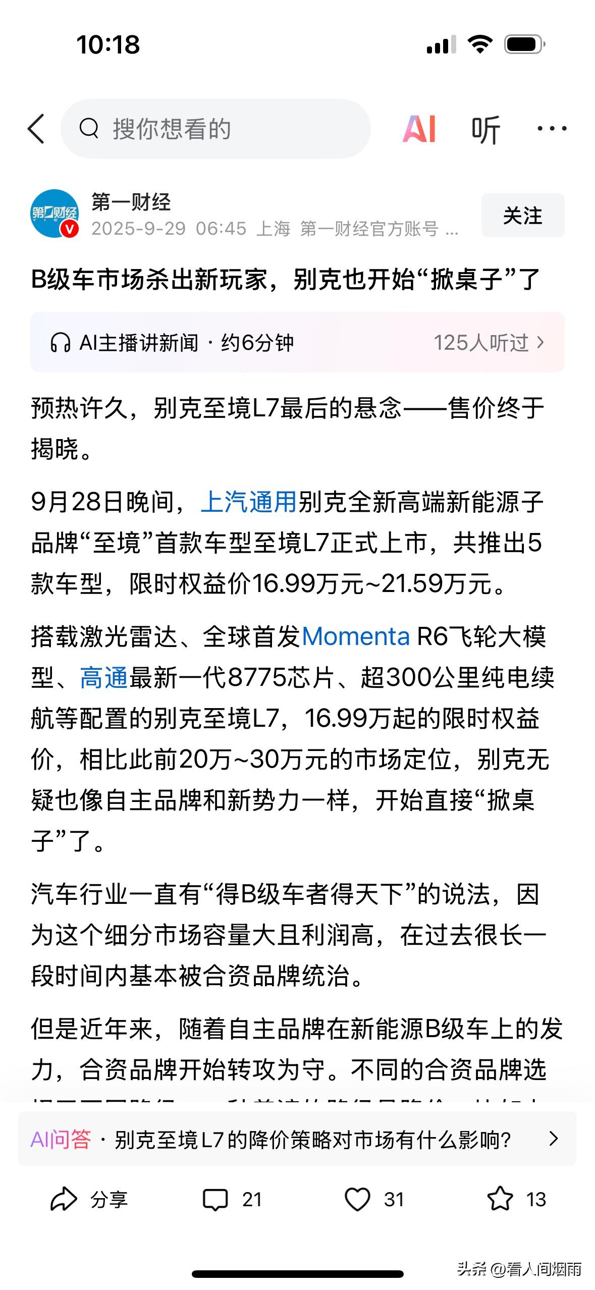 今天,让我觉得新能源车是真香了。 就是有了她们的存在! 油车才会放下架子,大幅度降价! 车这个东西,一户也就一台两台车,只要入手了一个品牌的车,就不会再买其他的车。 买了别克就不会再买丰田。 所以,车企要抢占市场。 看着新能源车遍地都是,油车开始慌了,开始降价了。 让降价潮再飞一会儿。 我期待那天的到来,用五六万就可以买到一台B级车。