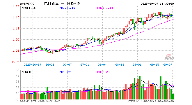 9月29日,截止午间收盘,中证红利质量ETF(159209)跌0.09%,报1.150元,成交额981.27万元。中证红利质量ETF(159209)重仓股方面,福耀玻璃截止午盘涨0.49%,贵州茅台涨0.43%,新和成跌1.14%,南山铝业涨2.11%,山金国际涨3.99%,海天味业跌0.77%,亿联网络跌0.83%,吉比特跌2.15%,格力电器跌0.60%,药明康德跌0.52%。
