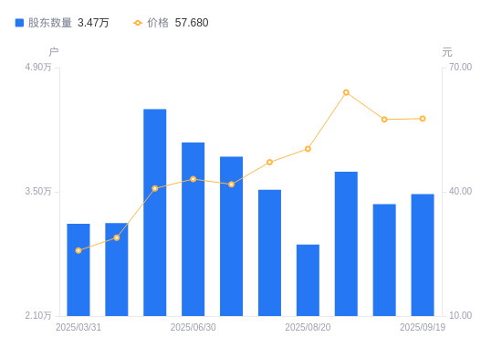 日期A股户数(户)流通A股户均持股数(股)户均持股市值(万元)2025-09-19347346991.0340.322025-09-10336037226.3341.532025-08-29372556517.9641.712025-08-20290508358.9242.112025-07-31352326892.2132.502025-07-18389756230.3126.042025-06-30405645986.2625.792025-06-10443265478.2022.362025-05-09314647717.6022.322025-03-31313877736.5319.98